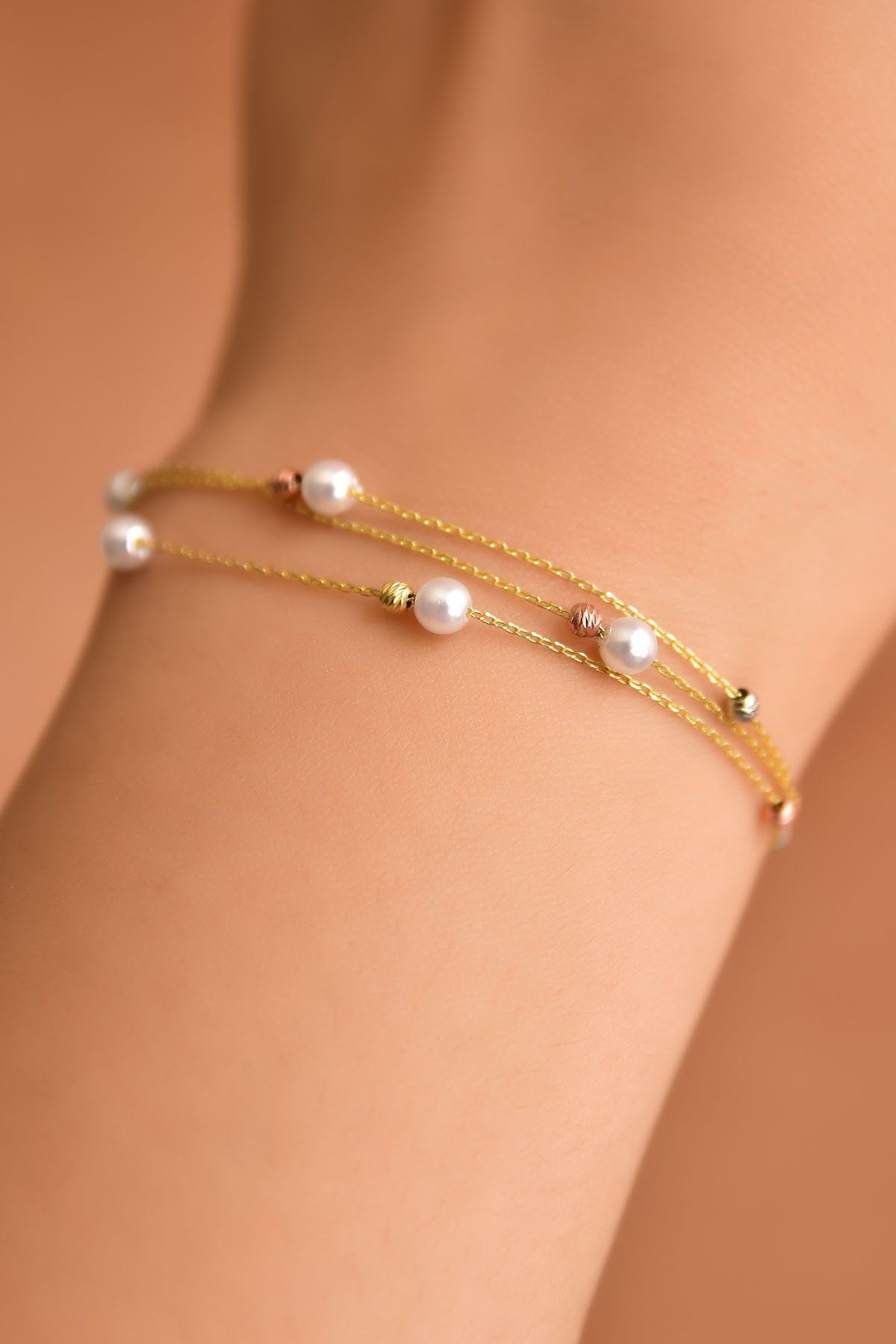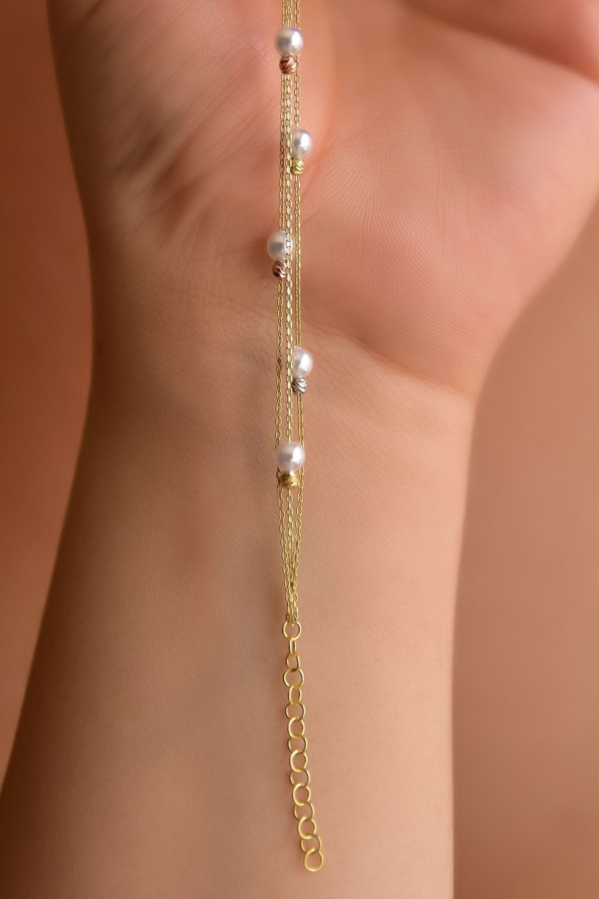 925 Ayar Gümüş Rose Kaplama Top Zincirli, Zirkon Taşlı Dalgalı Nazar Bileklik