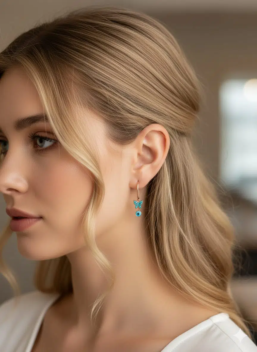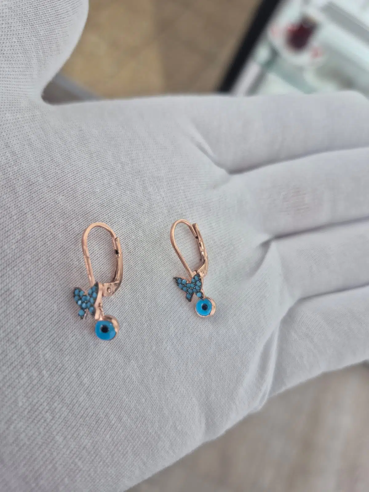 925 Ayar Papatya Silver firuze taşlı nazar küpe.firuze kelebek küpe.nazar küpe.rose.gold.rodaj