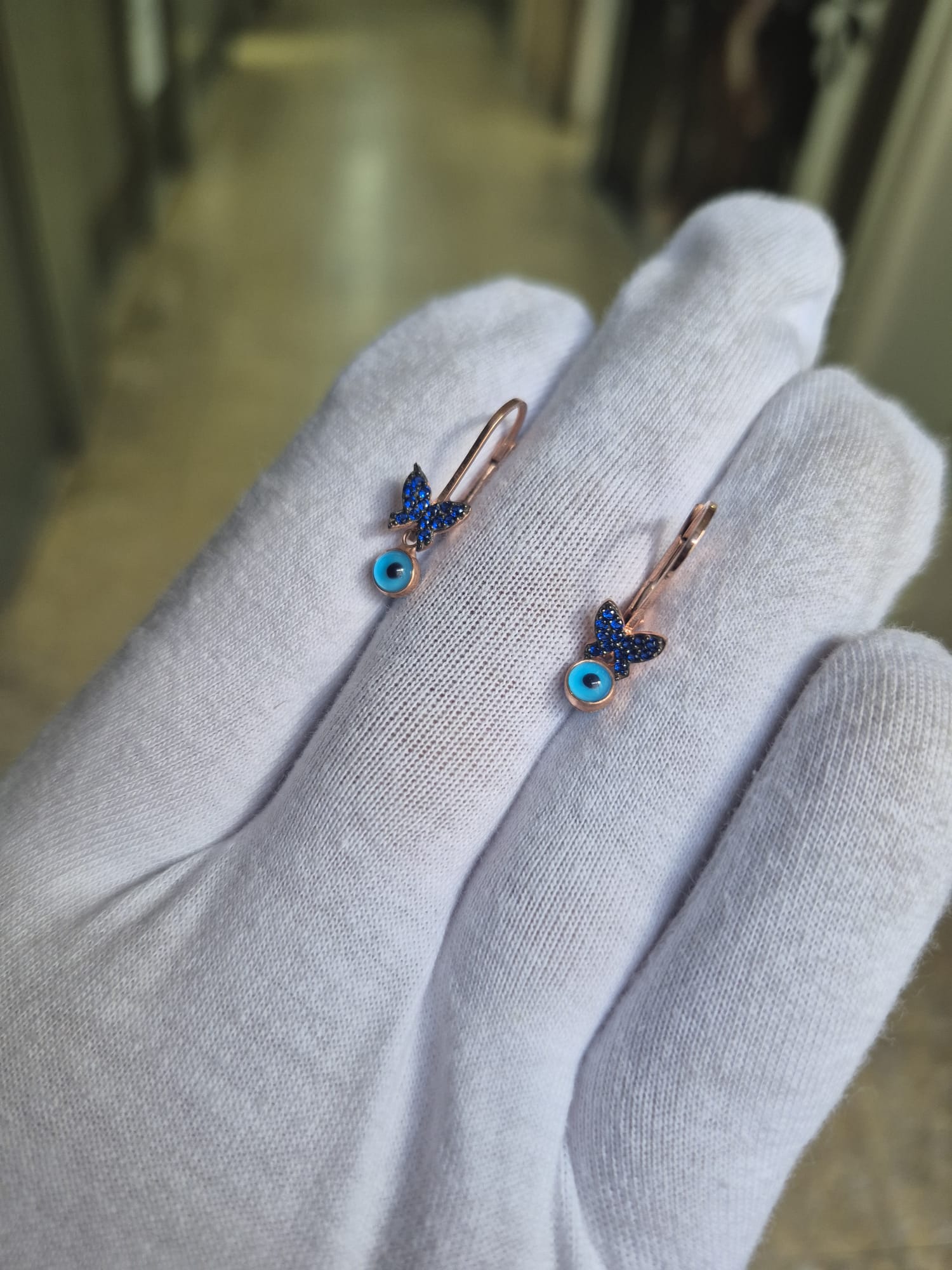 Etiketler925 Ayar Flamingo Silver Özel Tasarım Safir Taşlı Kelebek Küpe.Nazarlı Kelebek Küpe.rose.gold.rodaj