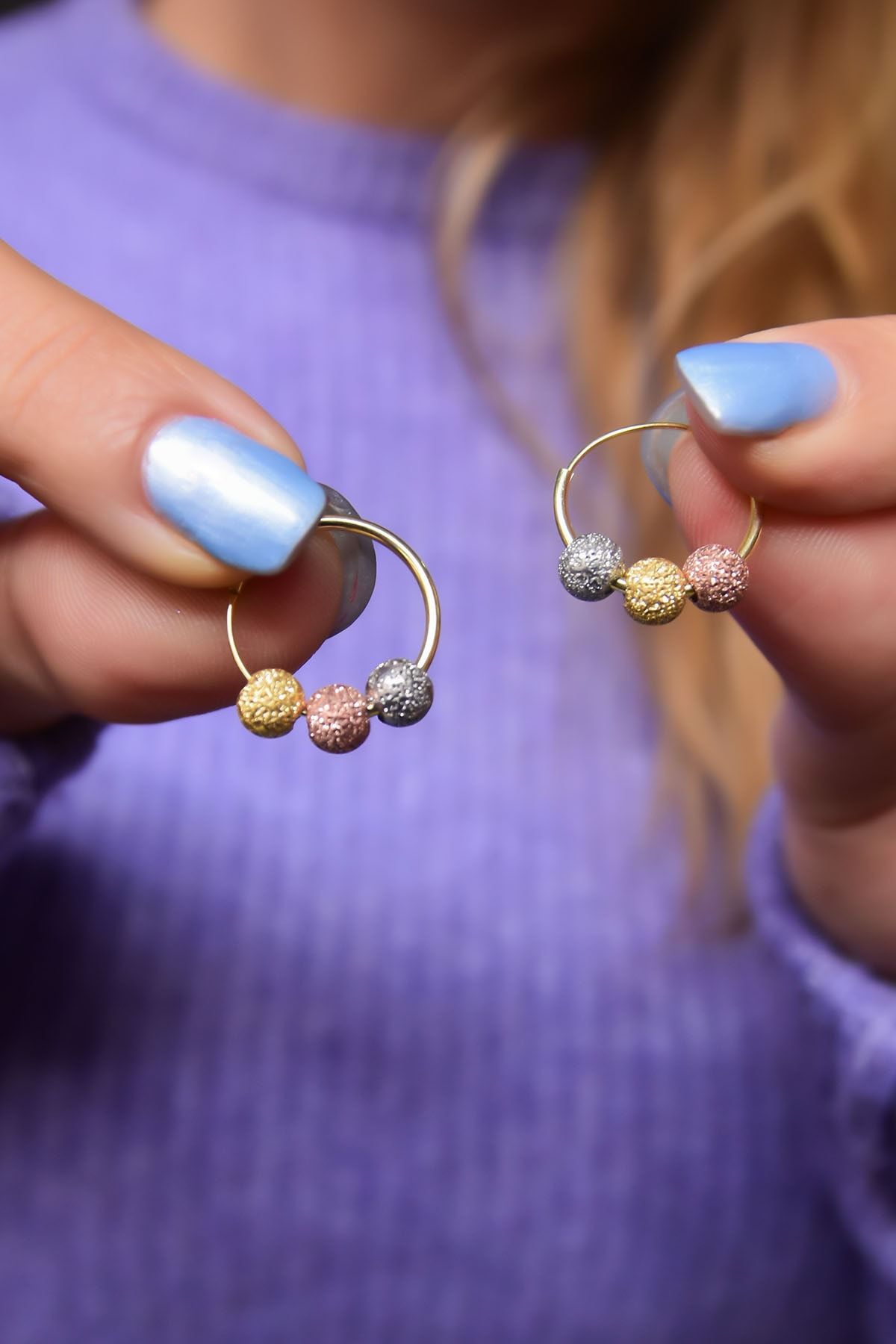 Halka Altın,Toplar Rose,Altın,Rodyum Kaplamadır. Maden : 925 Ayar Gümüş.. Kaplama: Rose,Altın, Rodyum. Halka Çap : 1,5 cm. Teslimat :Ürün kutusunda gönderilecektir.