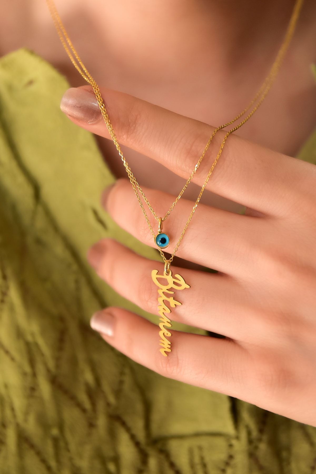 Etiketler925 Ayar Gümüş Altın Kaplama Camgöz Ve Bitanem Yazılı Asansörlü Kolye