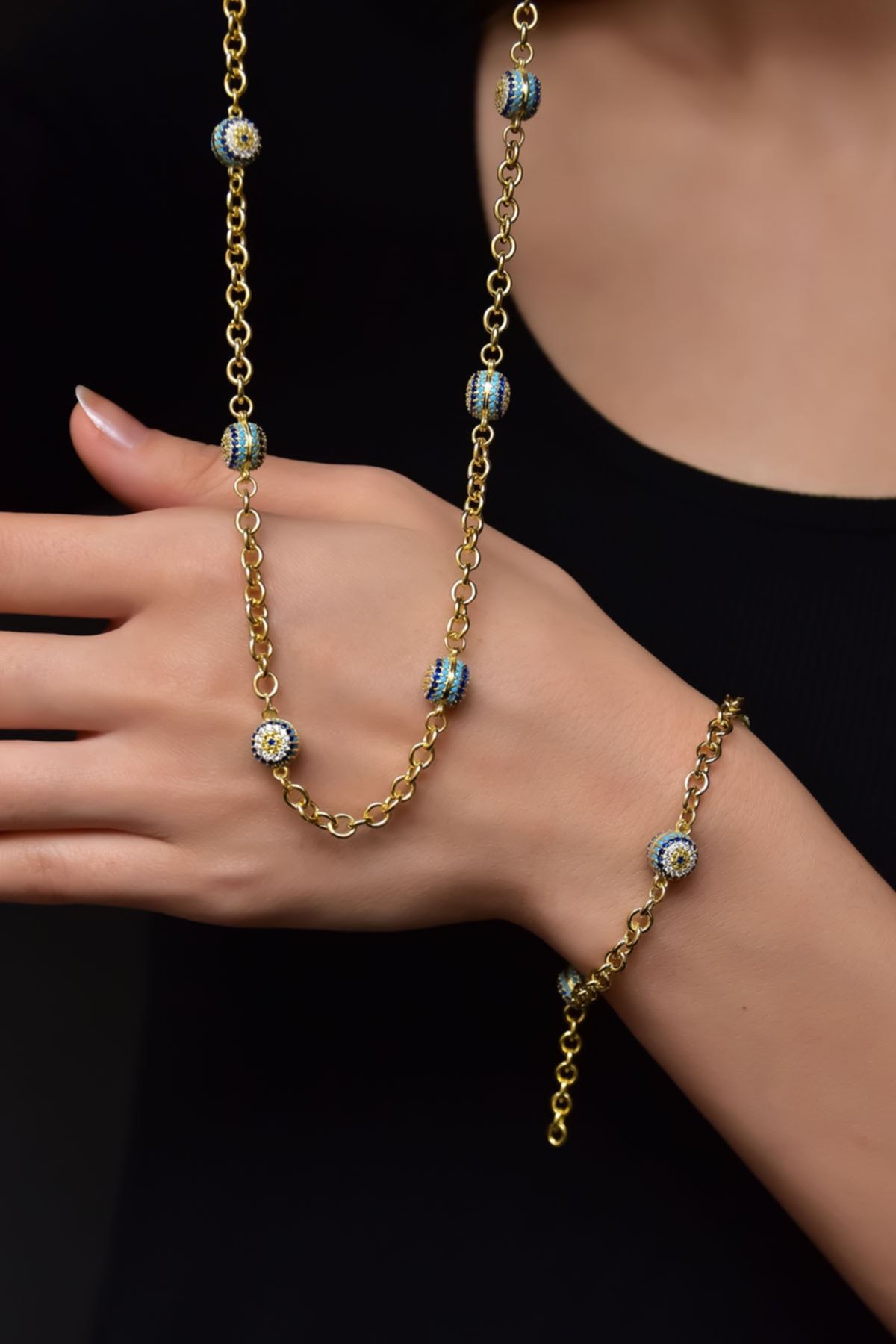 Maden : 925 Ayar Gümüş. Kaplama: Altın. Figür En*Boy:7 mm. Kolye Uzunluğu: 42 cm. Kolye Ağırlık: 20,53 Bileklik Uzunluğu: 18 cm. Ağırlığı : 8,81 Gr ( +-). Gümüş ve değerli taşlar nedeniyle belirtilen ortalama ürün ağırlığında ± %5 sapma olabilmektedir. Teslimat: Ürün ahşap hediye kutusunda gönderilecektir. Kullanım: Parfüm, dezenfektan, çamaşır suyu gibi kimyasallardan uzak tutunuz.