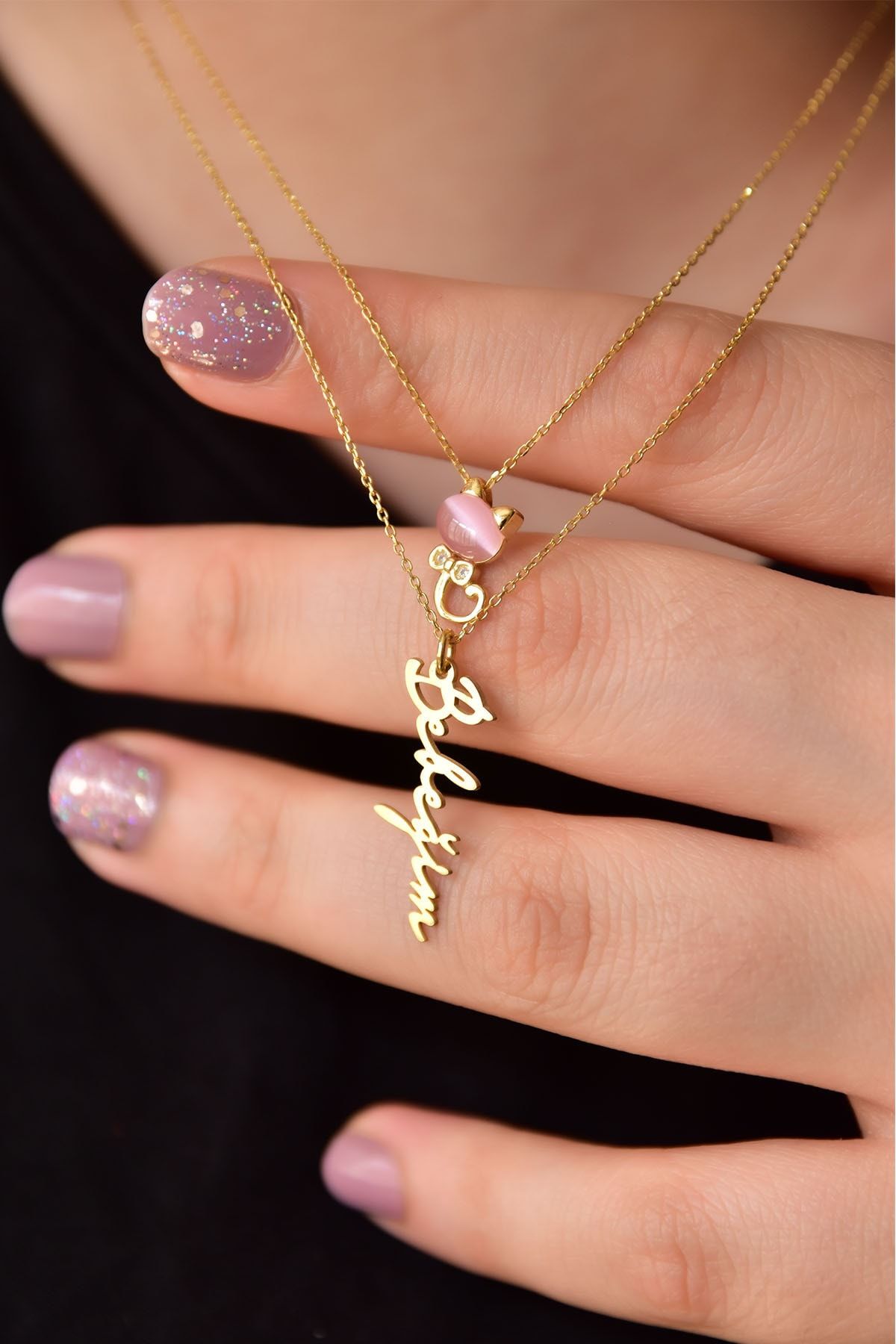 925 Ayar Gümüş Altın Kaplama Kedi Ve Bebeğim Yazılı Asansörlü Kolye