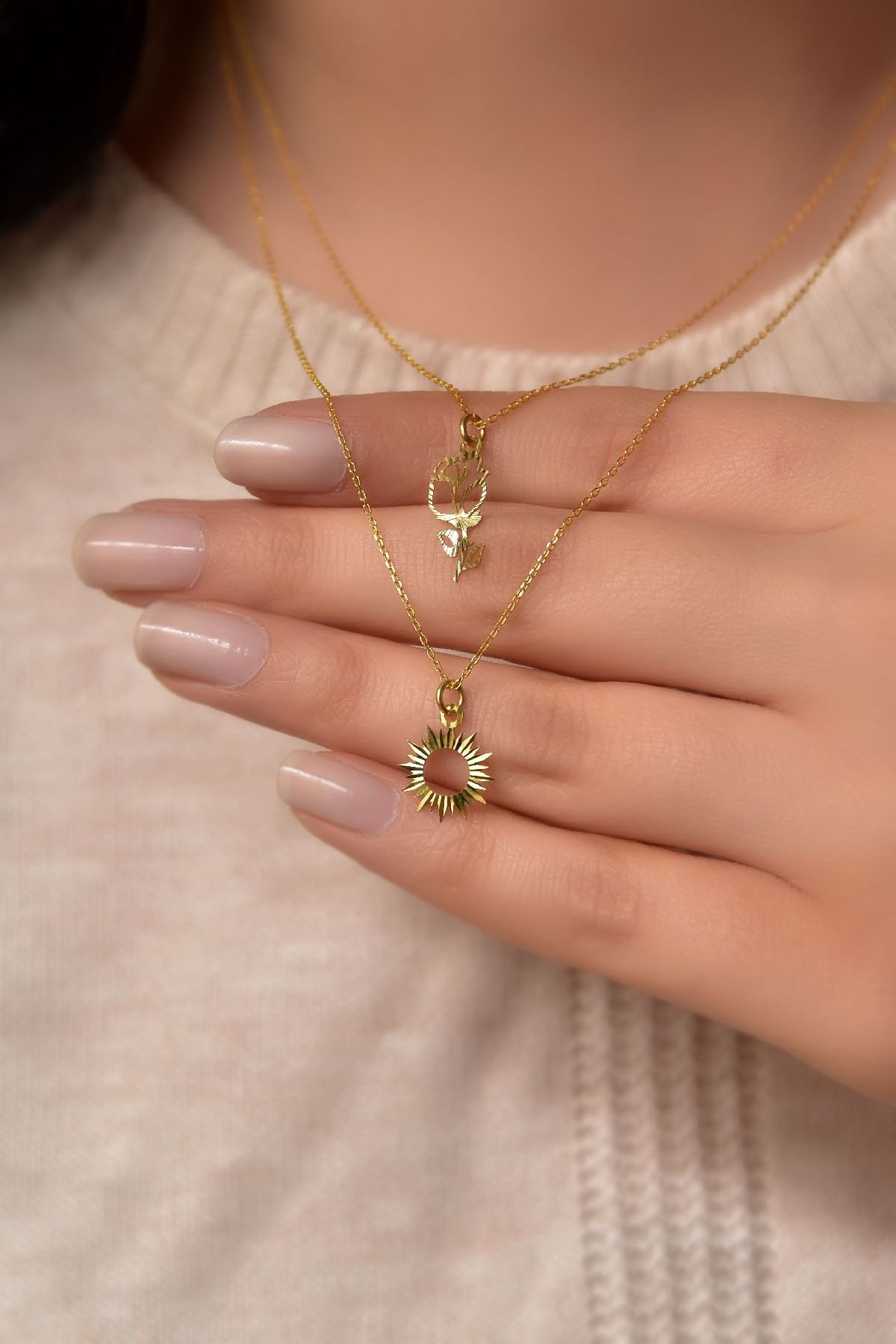 925 Ayar Gümüş Altın Kaplama Kristal Kesim Gül Ve Güneş Asansörlü Kolye
