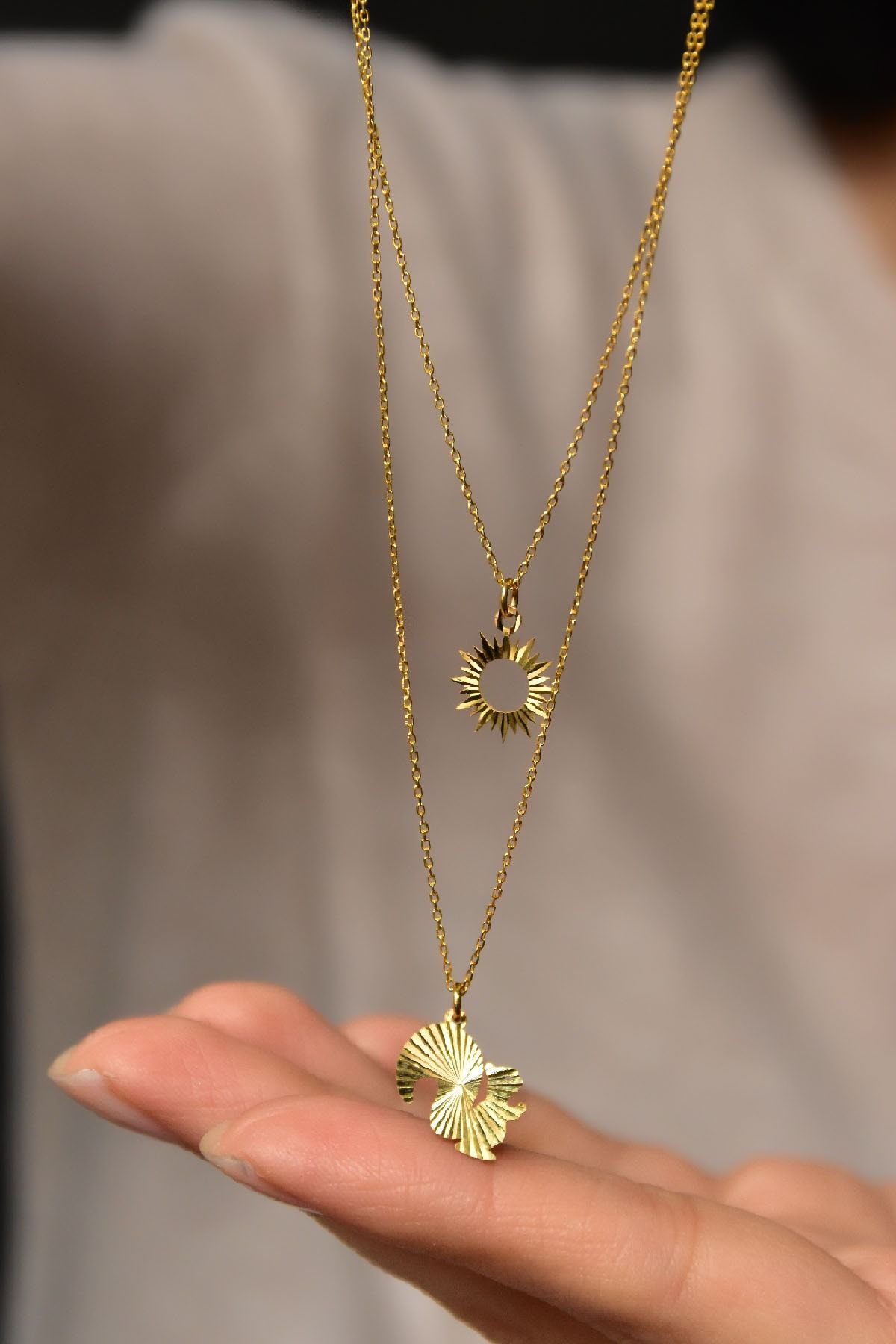 925 Ayar Gümüş Altın Kaplama Kristal Kesim Güneş Ve Sincap Asansörlü Kolye