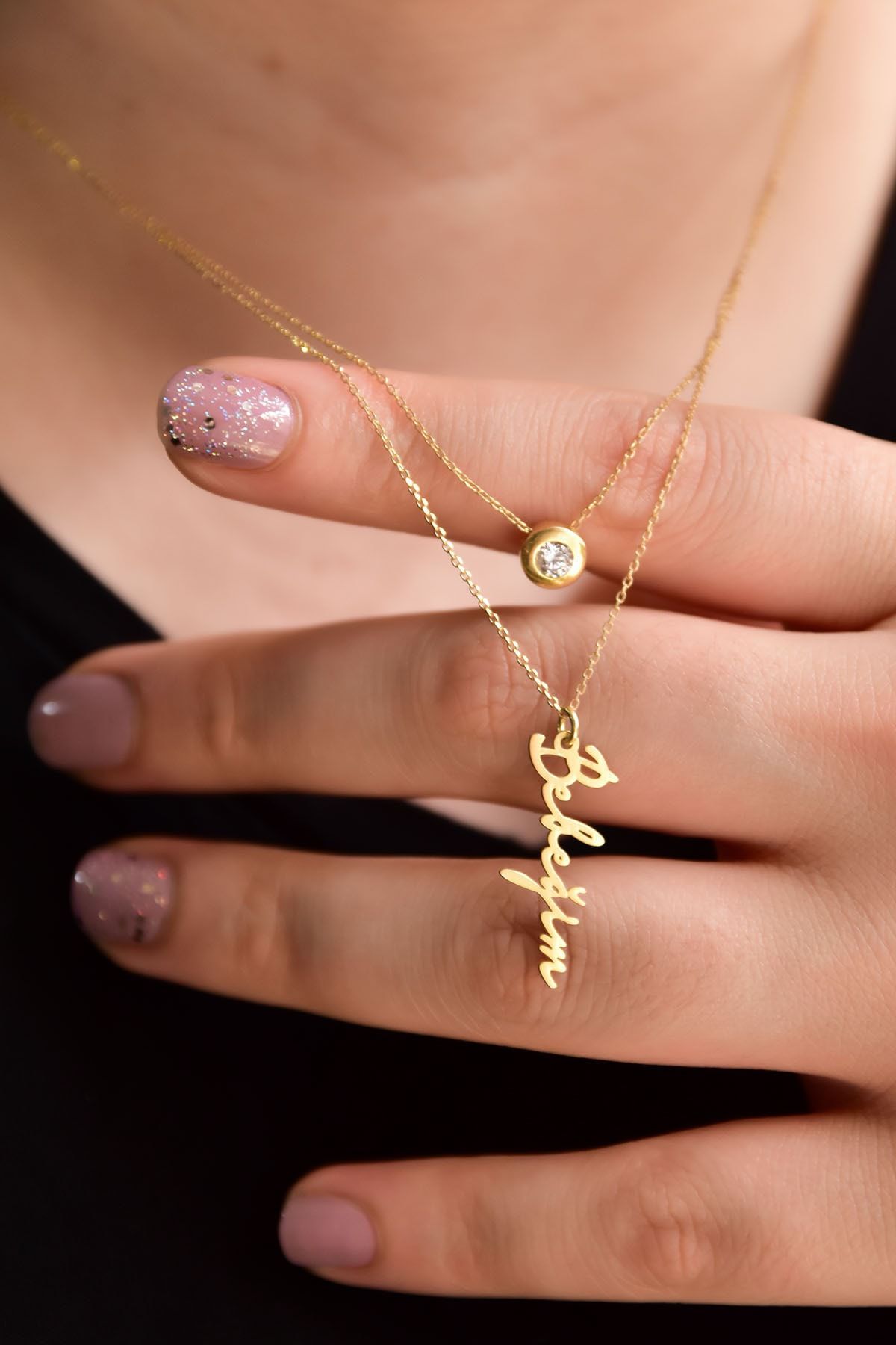 Etiketler925 Ayar Gümüş Altın Kaplama Tektaş Ve Bebeğim Yazlı Asansörlü Kolye