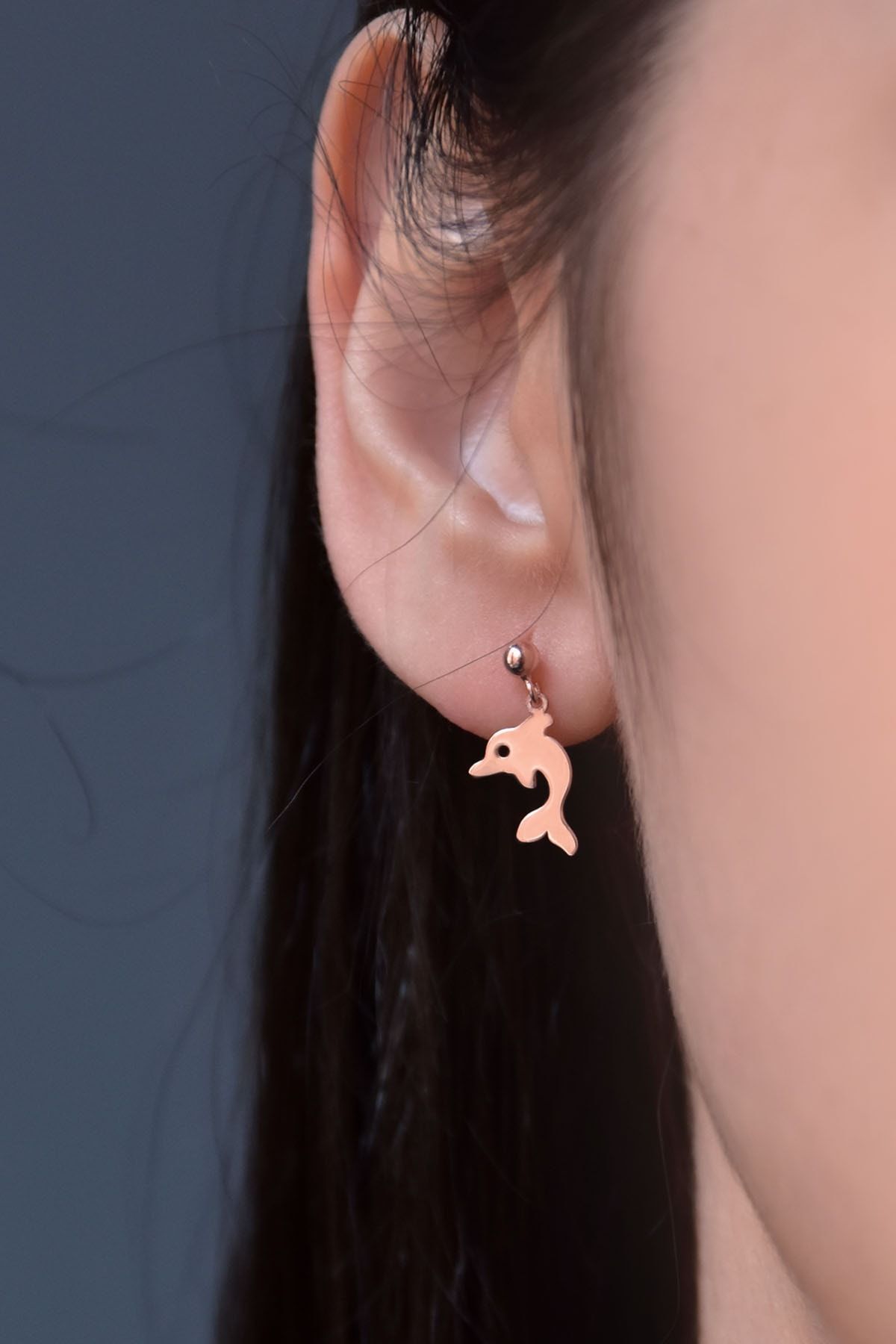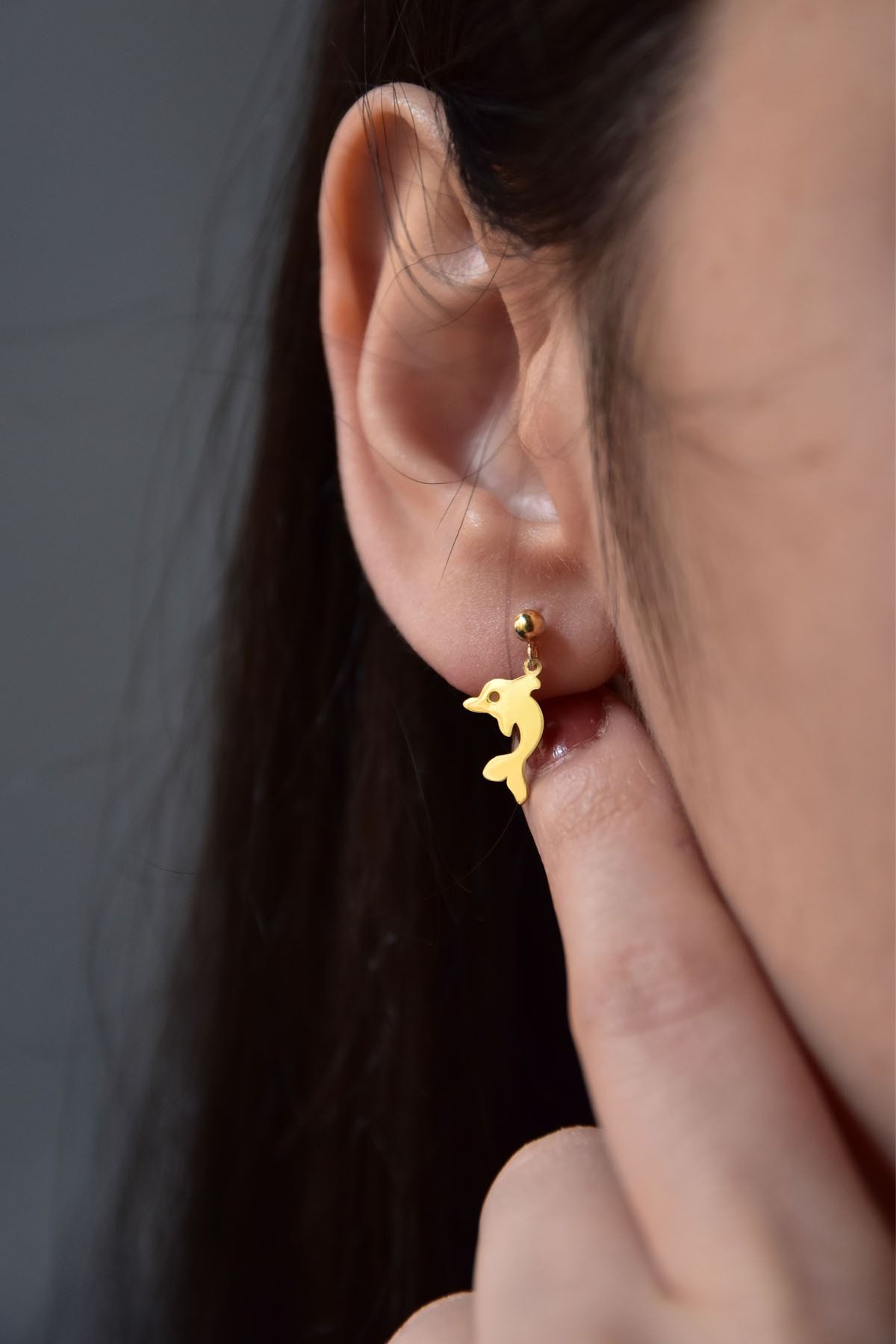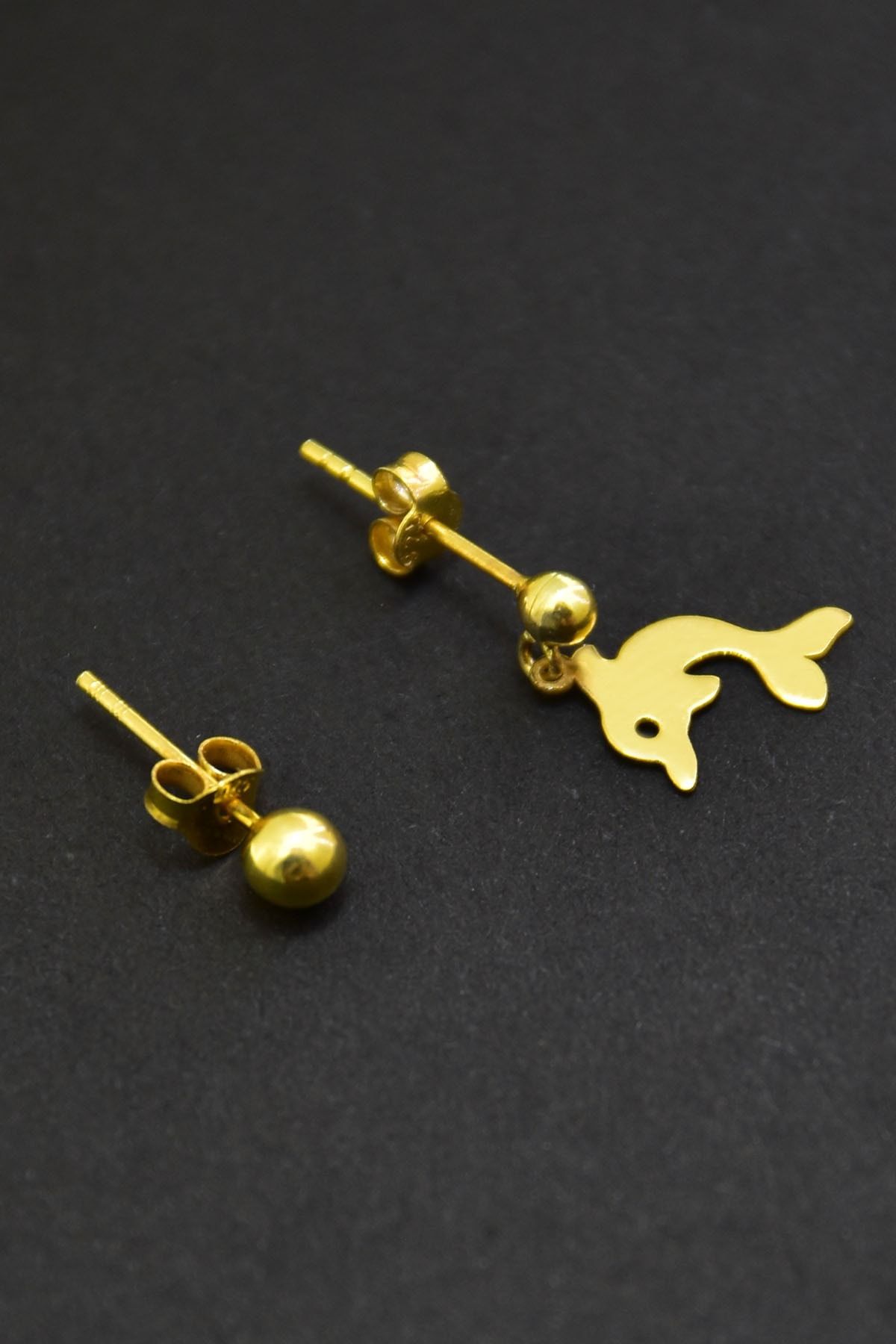 Etiketler925 Ayar Gümüş Altın Kaplama Yunus Balığı Model Çivili Kadın Top Küpe