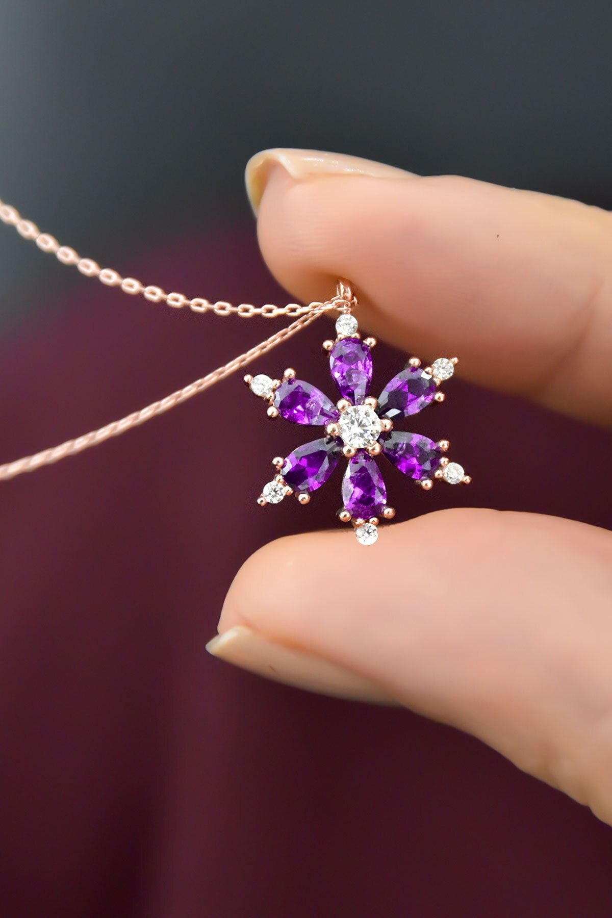 Maden : 925 Ayar Gümüş.Kaplama: Rose Altın. .Renk : Mor, Beyaz.Taş: Zirkon.Ürün Ebat En x Boy: 1,5 x 1,5 cm.Zincir Uzunluğu: 42 cm.Ürün Ağırlığı : 2,35 Gr ( +-). Gümüş ve değerli taşlar nedeniyle belirtilen ortalama ürün ağırlığında ± %5 sapma olabilmektedir.Teslimat: Ürün ahşap hediye kutusunda gönderilecektir.Kullanım: Parfüm,dezenfektan,çamaşır suyu gibi kimyasallardan uzak tutunuz.