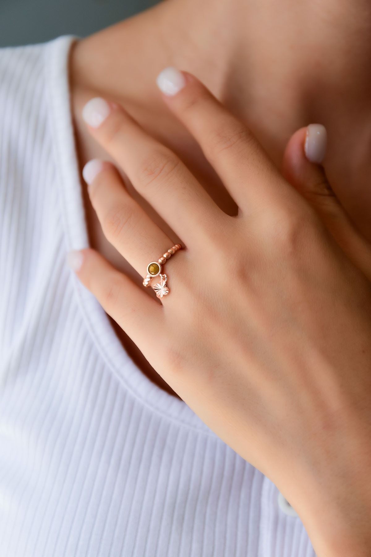 Etiketler925 Ayar Gümüş Bal Rengi Ay Taşlı Çiçek Motifli Ayarlanabilir Kadın Yüzük