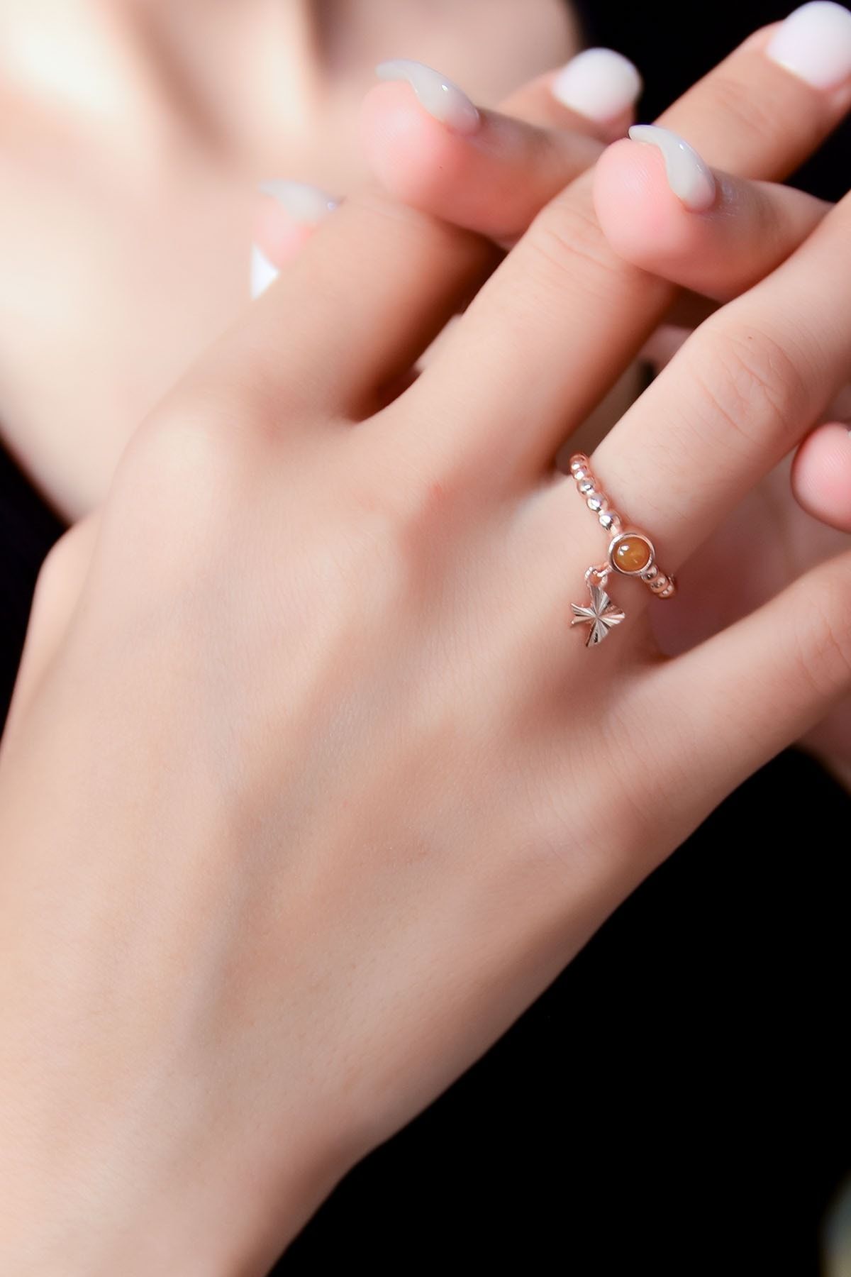 925 Ayar Gümüş Bal Rengi Ay Taşlı Kırlangıç Motifli Ayarlanabilir Kadın Yüzük