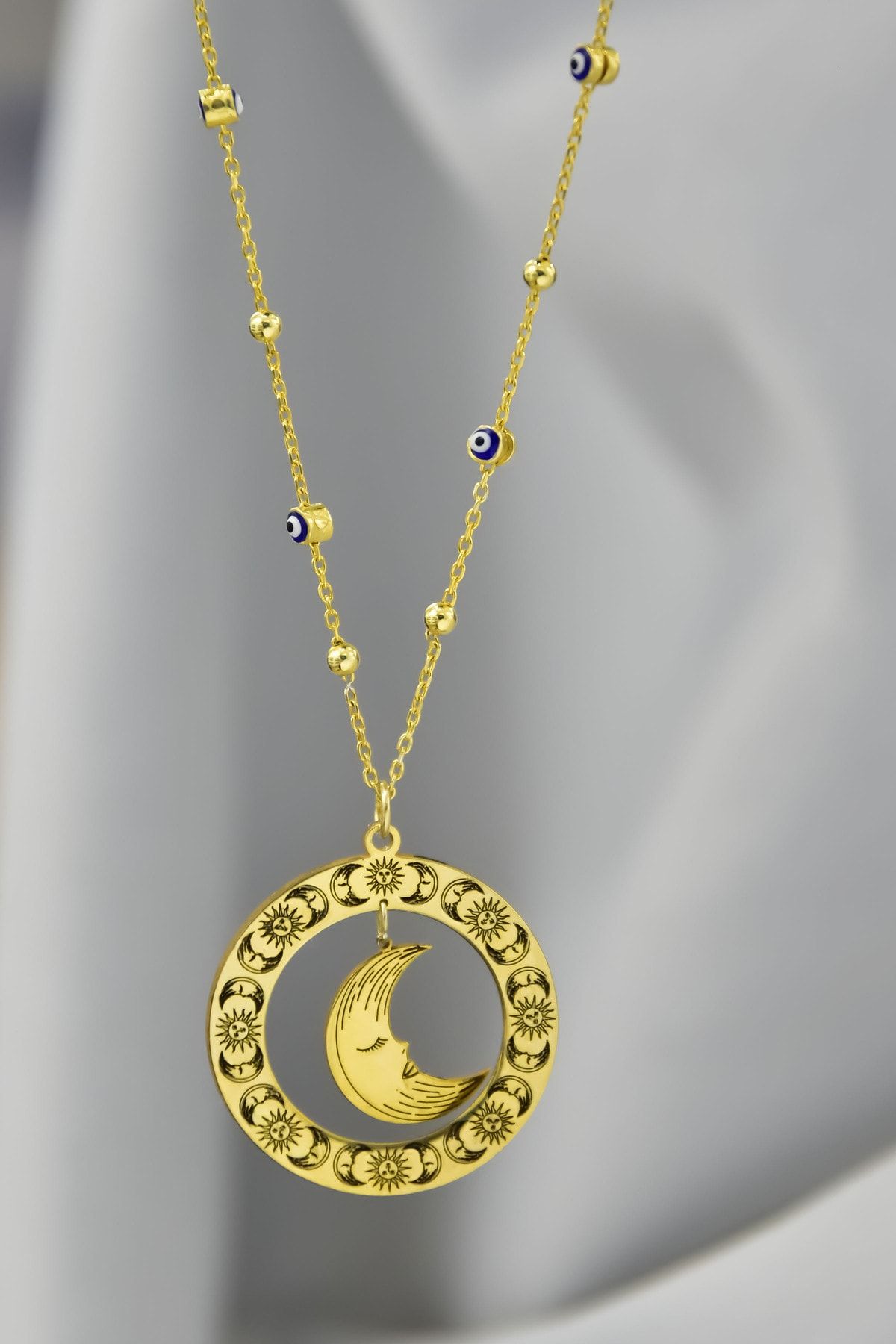 925 Ayar Gümüş Doğanın Güçleri Çemberli, Yenilenme Tılsımı Ay Sallantılı Nazar Mineli Zincirli Kolye
