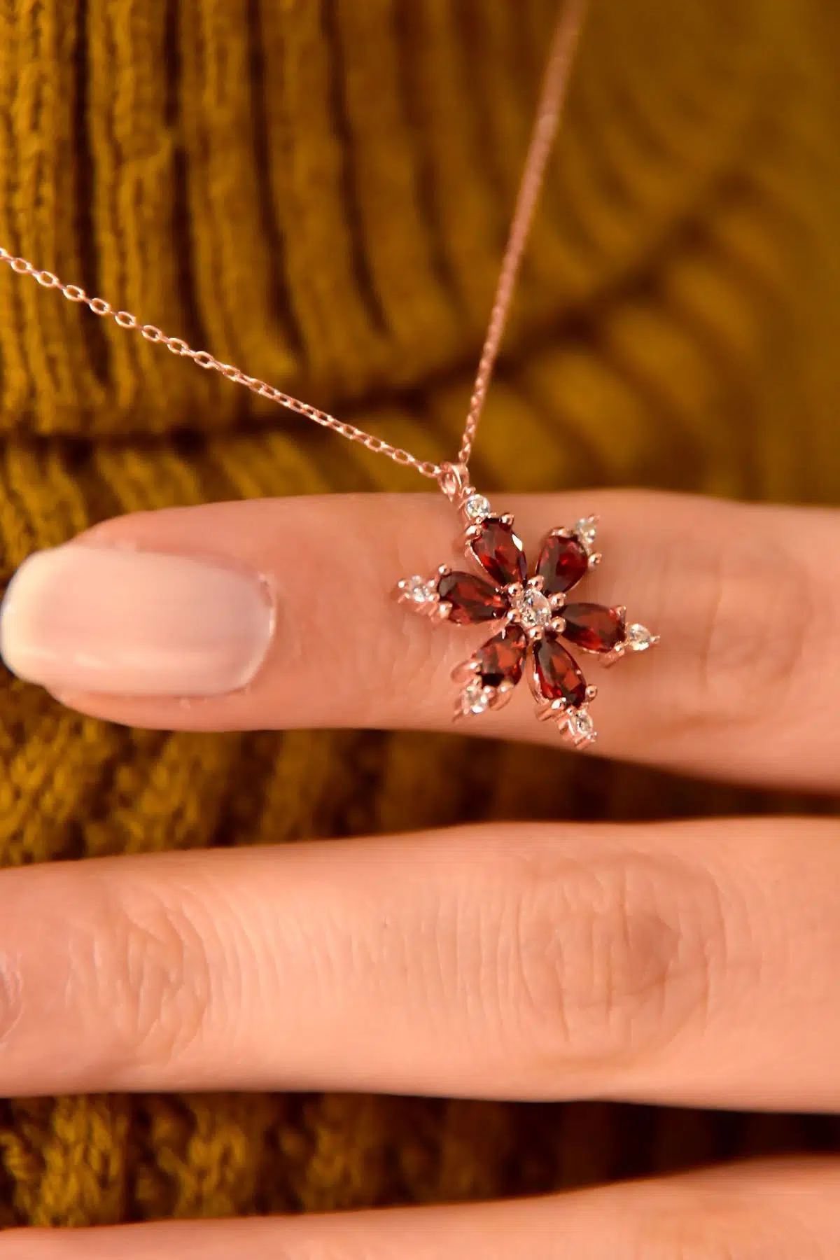 Maden : 925 Ayar Gümüş.Kaplama: Rose Altın. .Renk : Garnet.Taş: Zirkon.Ürün Ebat En x Boy: 1,5 x 1,5 cm.Zincir Uzunluğu: 42 cm.Ürün Ağırlığı : 2,35 Gr ( +-). Gümüş ve değerli taşlar nedeniyle belirtilen ortalama ürün ağırlığında ± %5 sapma olabilmektedir.Teslimat: Ürün ahşap hediye kutusunda gönderilecektir.Kullanım: Parfüm,dezenfektan,çamaşır suyu gibi kimyasallardan uzak tutunuz.