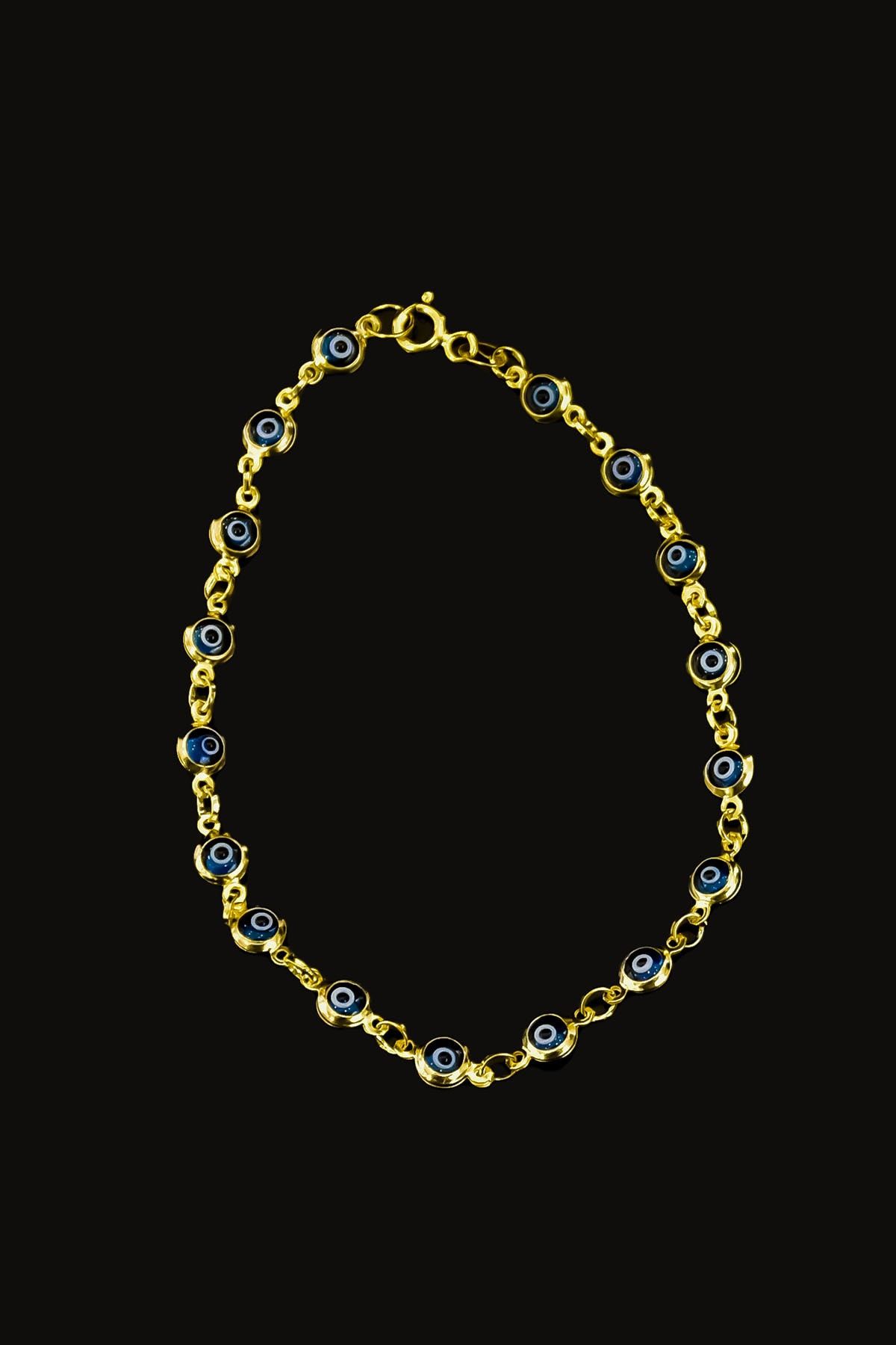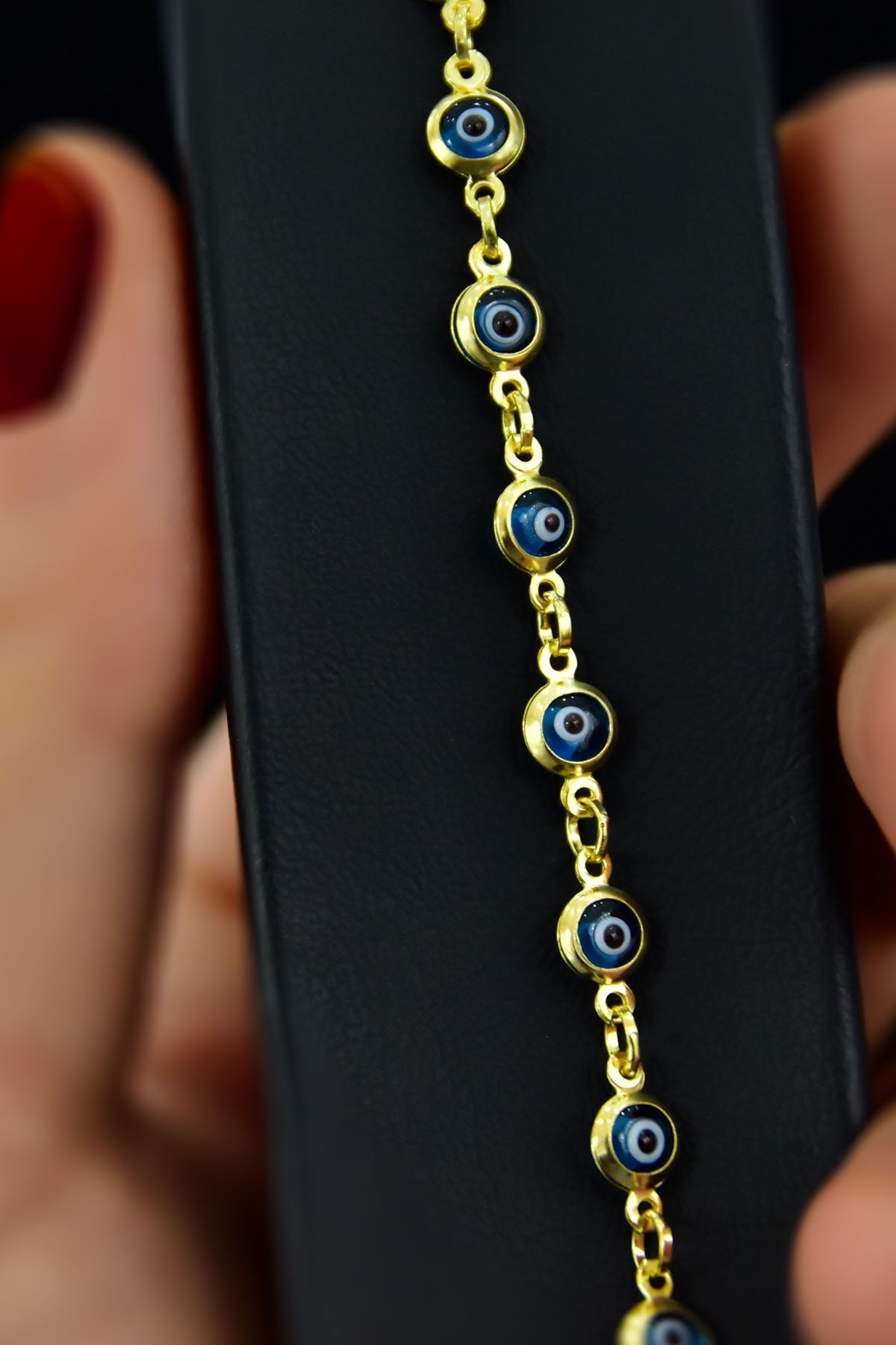 Maden: 925 Ayar Gümüş. Kaplama: Gold. Zincir Uzunluğu: 18 cm. Taş: Cam Göz. Ürün Ağırlığı: 2,31 Gr ( +-). Gümüş ve değerli taşlar nedeniyle belirtilen ortalama ürün ağırlığında ± %5 sapma olabilmektedir. Teslimat: Ürün ahşap hediye kutusunda gönderilecektir. Kullanım: Parfüm, dezenfektan, çamaşır suyu gibi kimyasallardan uzak tutunuz.
