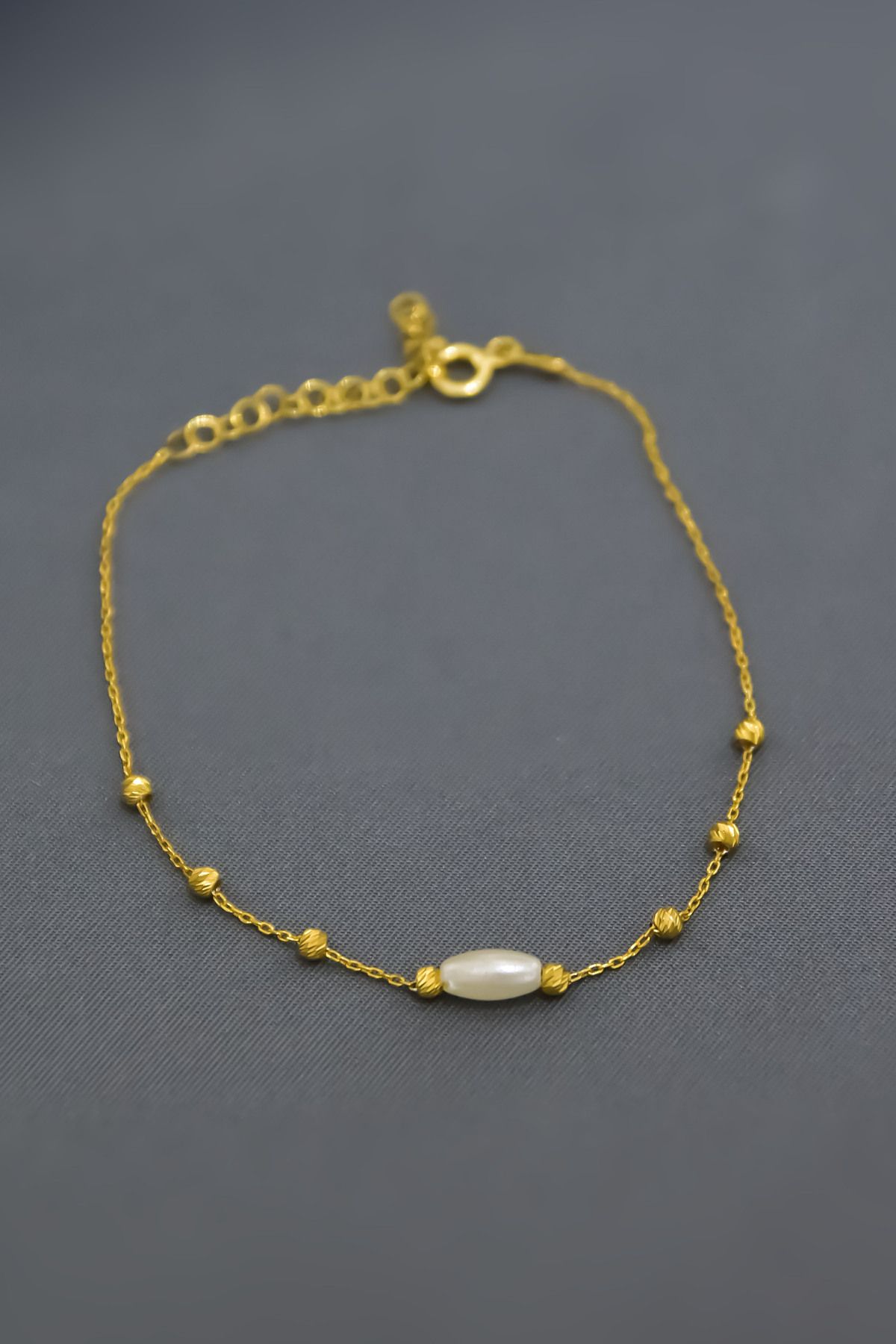 925 Ayar Gümüş Gold Kaplama Dorika Toplu , Elips Inci Görünümlü Boncuk Bileklik