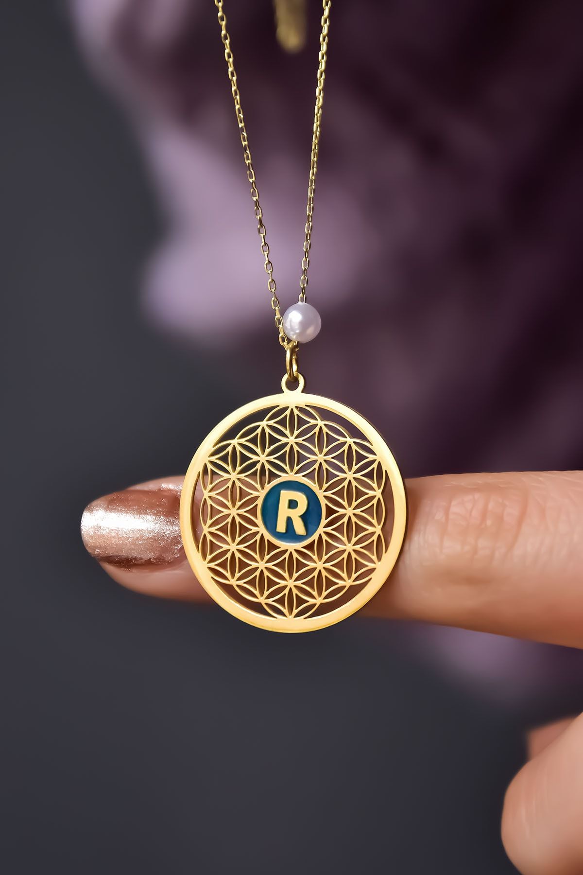 Etiketler925 Ayar Gümüş Gold Kaplama Incili Parlayan Rüya Serisi Harfli Yaşam Çiçeği Kolye