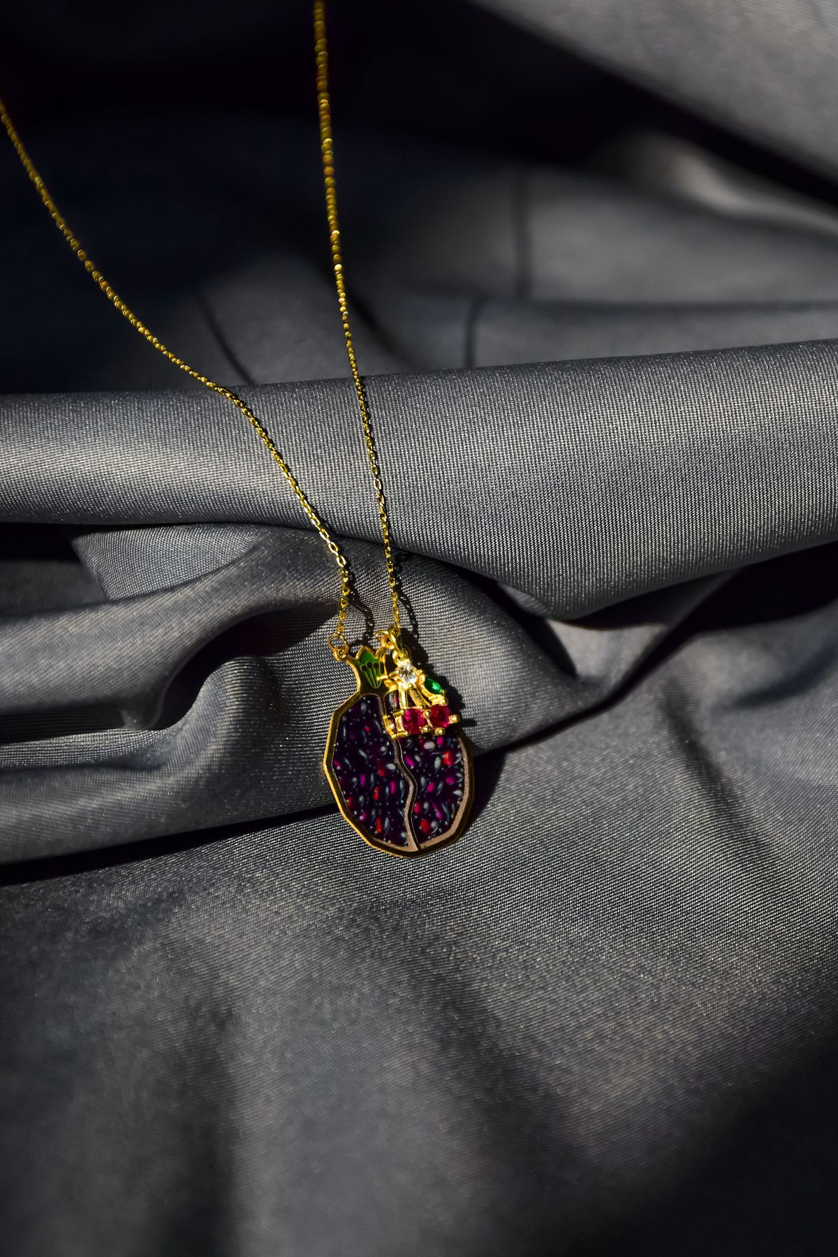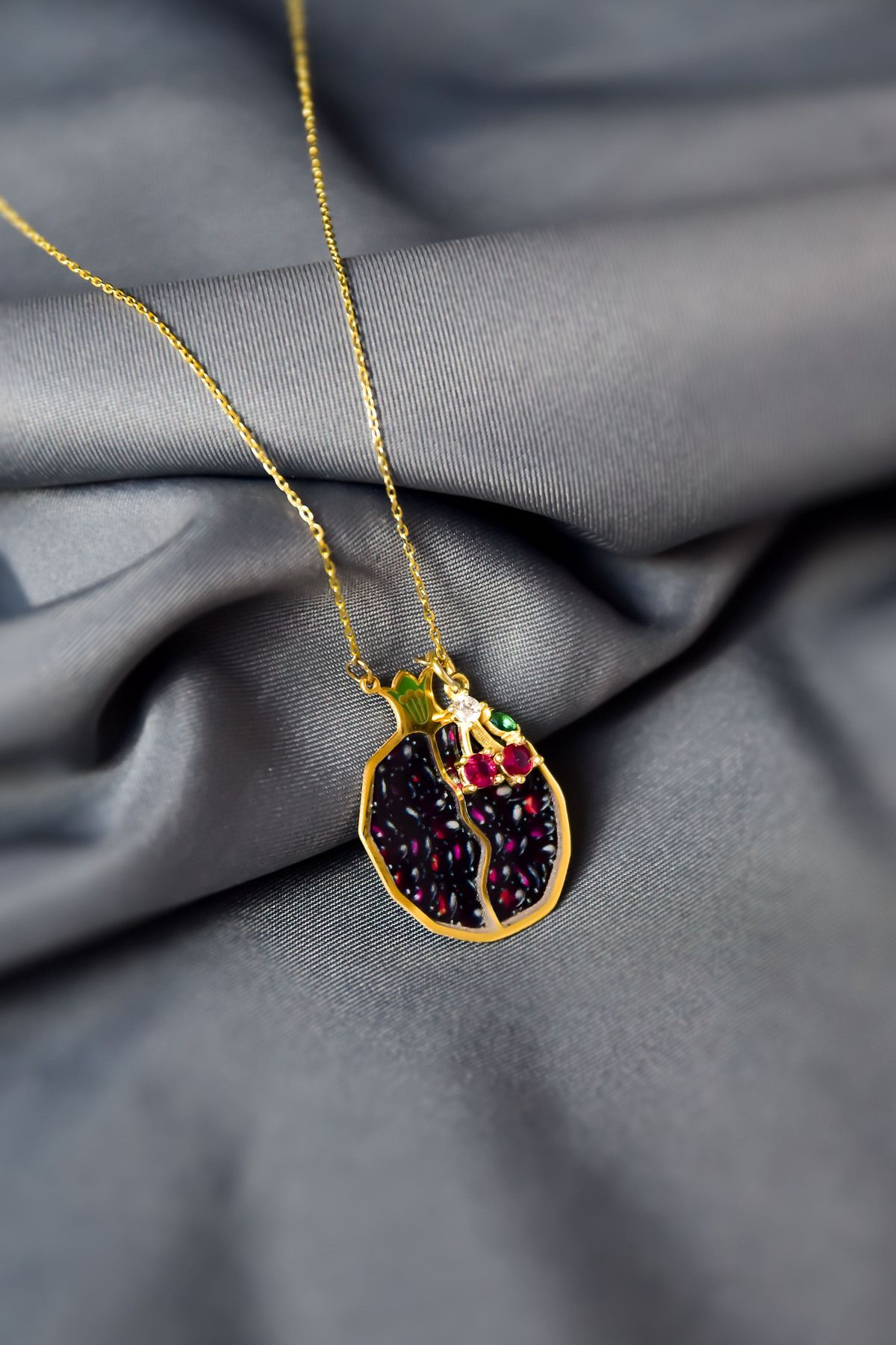 Etiketler925 Ayar Gümüş Gold Kaplama Kiraz Sallantılı , Mineli Bolluk Ve Bereket Tılsımı Nar Taneli Kolye