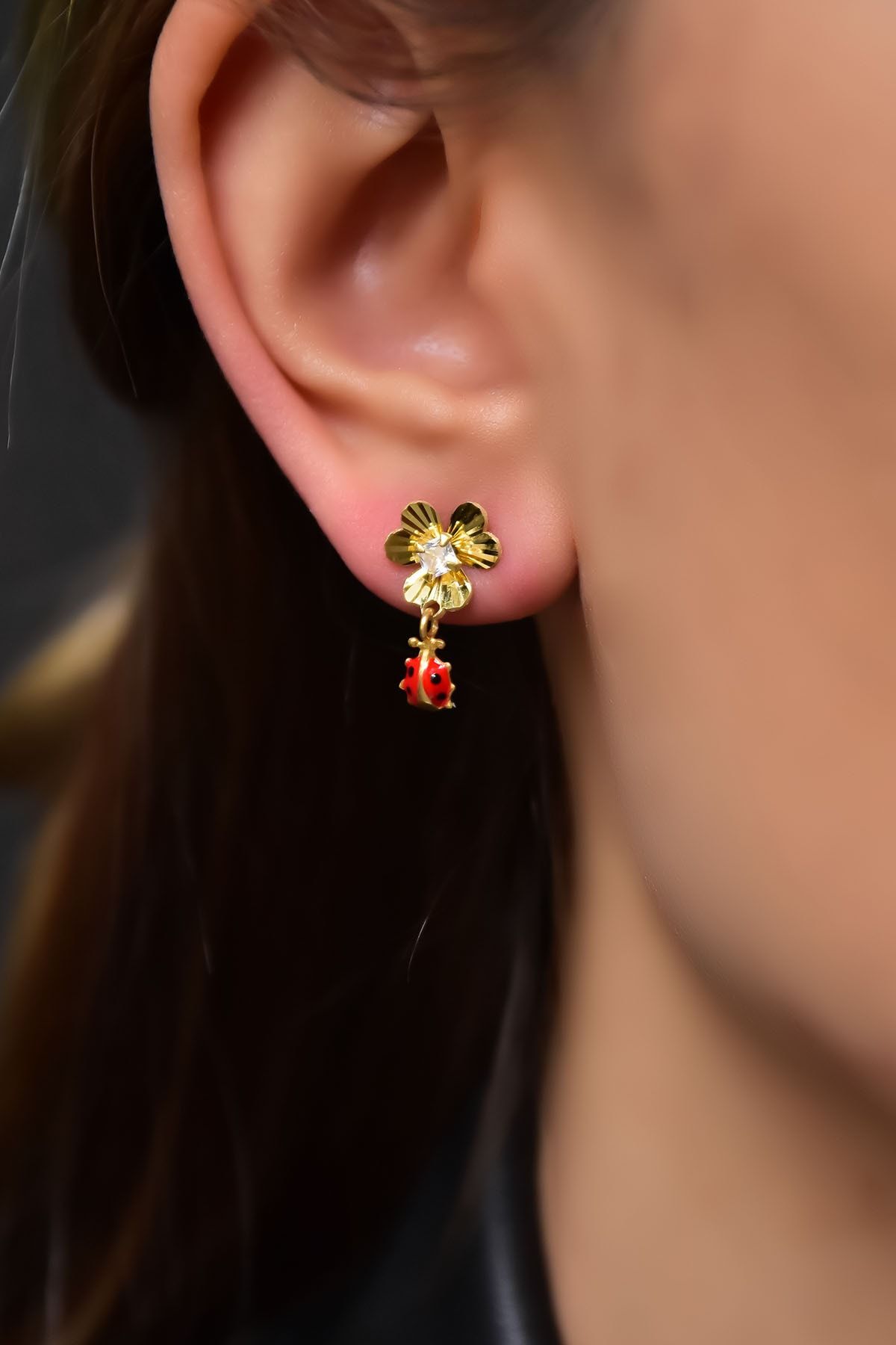 925 Ayar Gümüş Gold Kaplama Kristal Kesim Uğur Böcekli Frezya Çiçeği Küpe