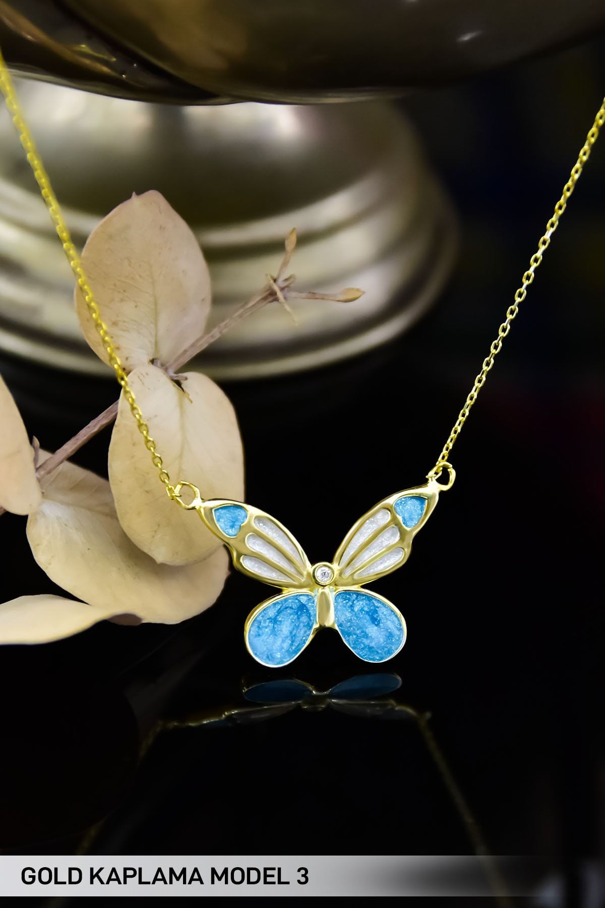 925 Ayar Gümüş Gold Kaplama Mavi Mineli Sedef Kelebek Kolye Model 3