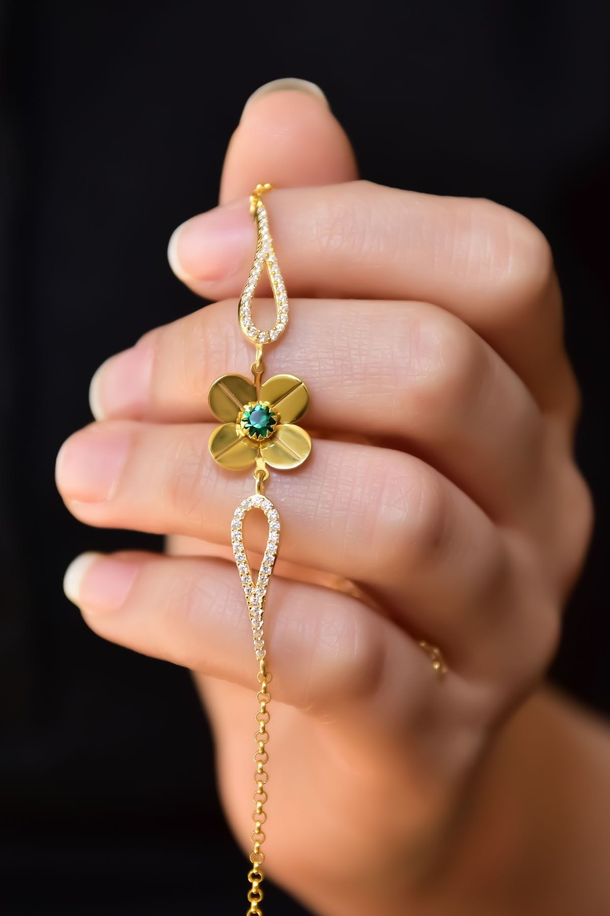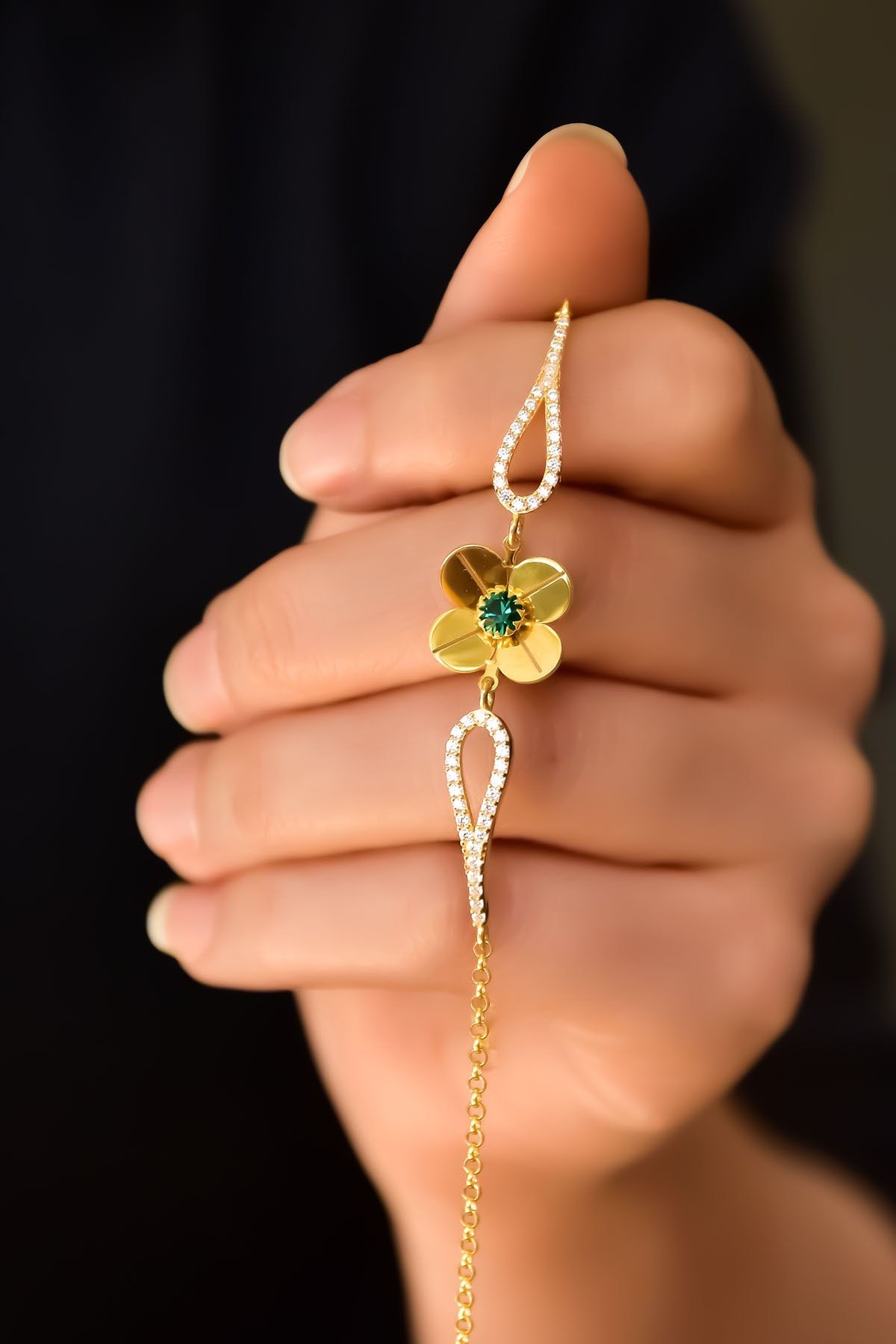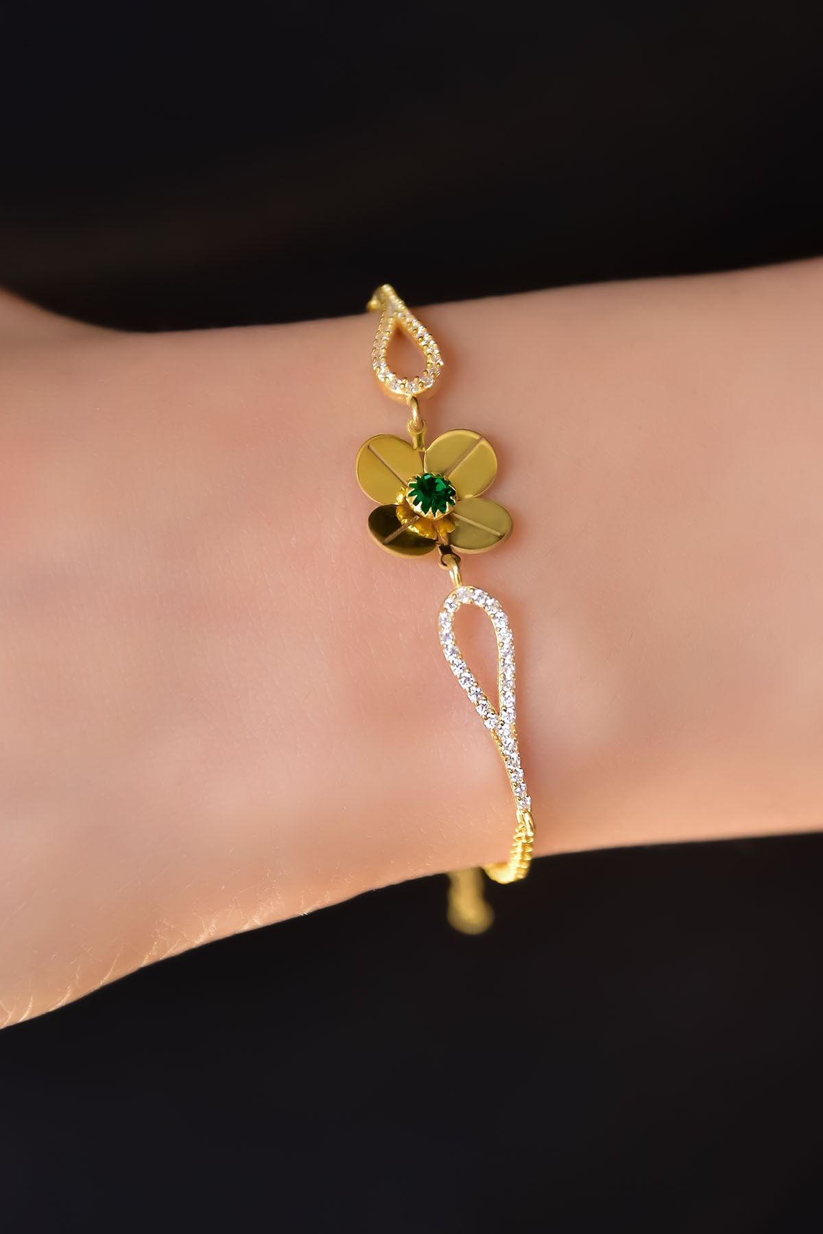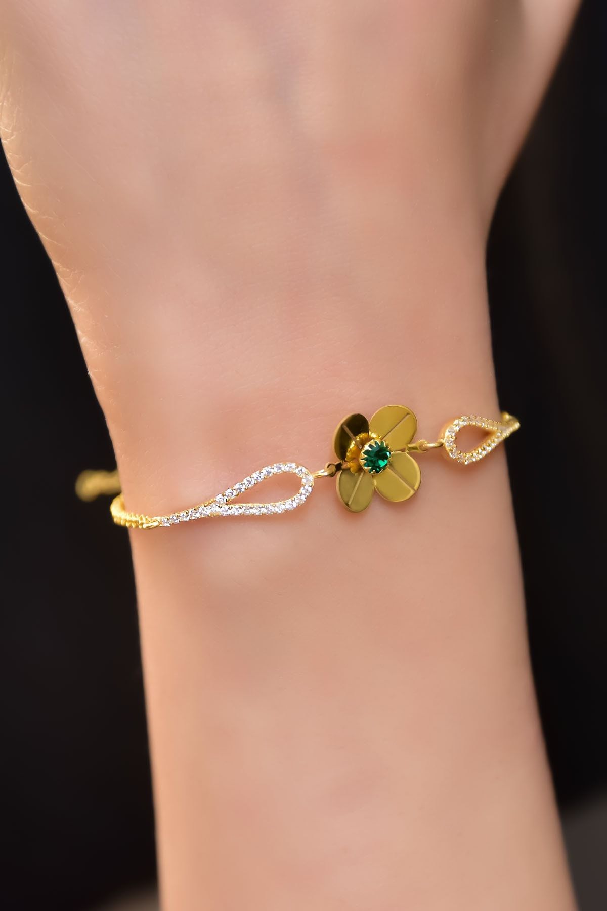 Etiketler925 Ayar Gümüş Gold Kaplama Mayıs Doğum Taşlı Şans Dört Yapraklı Yonca Bileklik