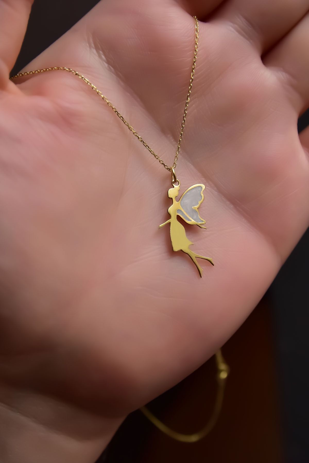 Etiketler925 Ayar Gümüş Gold Kaplama Parlayan Rüya Serisi Beyaz Kanatlı Ebruli Cam Boyalı Su Perisi Kolye