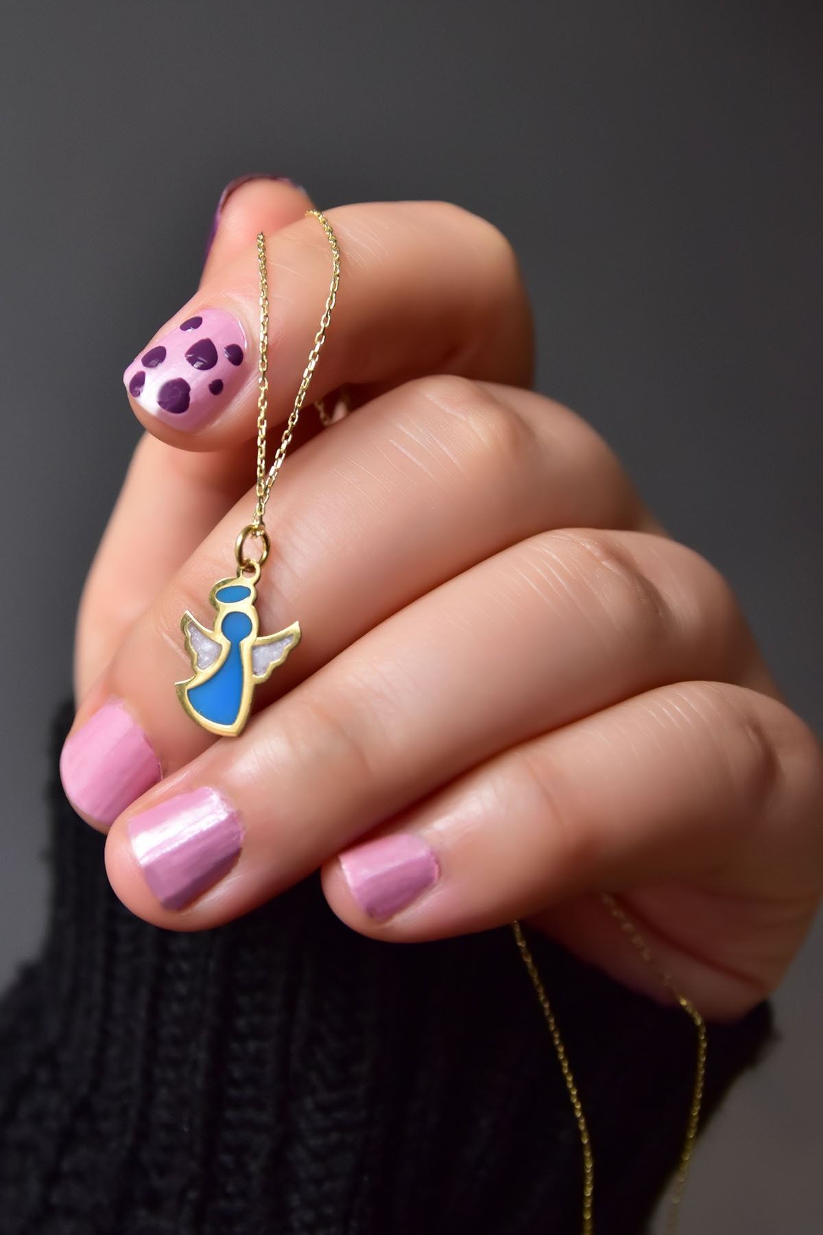 Etiketler925 Ayar Gümüş Gold Kaplama Parlayan Rüya Serisi Tasarım Beyaz-mavi Ebruli Cam Boyalı Melek Kolye