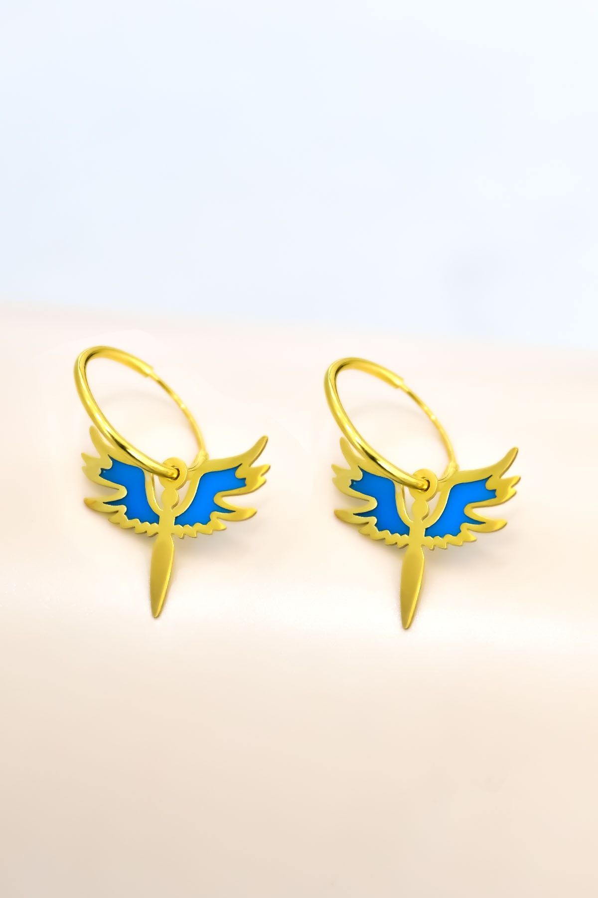925 Ayar Gümüş Gold Kaplama Parlayan Rüya Serisi Tasarım Ebruli Mavi Cam Boya Mikail Meleği Küpe