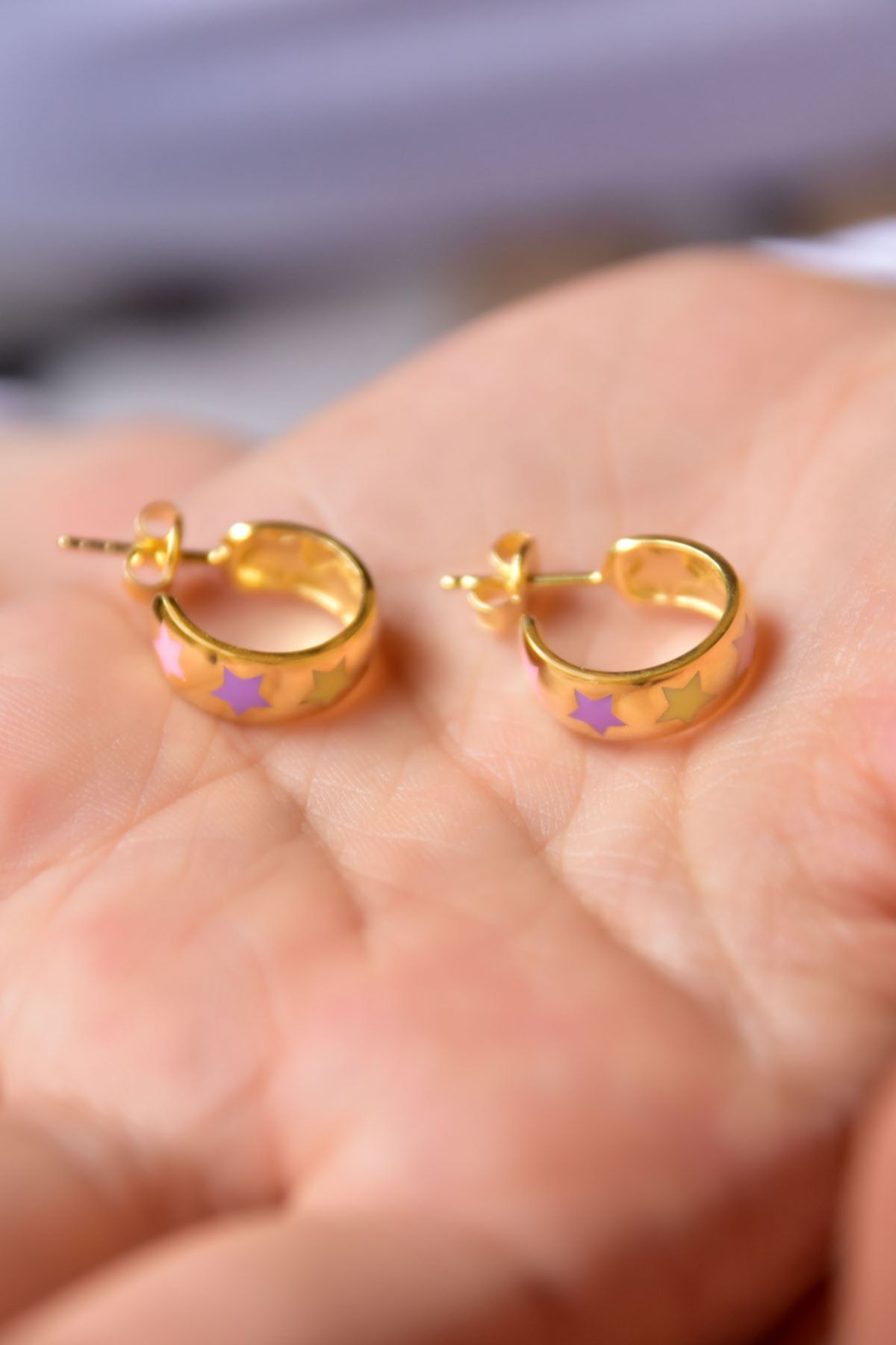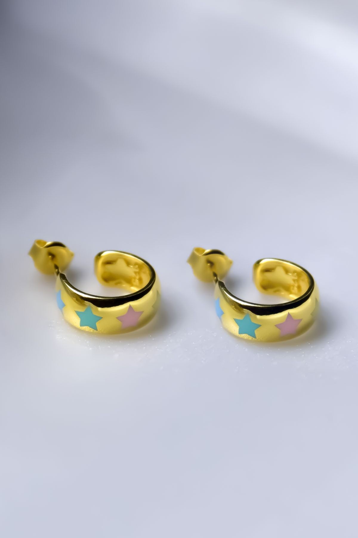 925 Ayar Gümüş Gold Kaplama Renkli Mineli Yıldız Halka Küpe