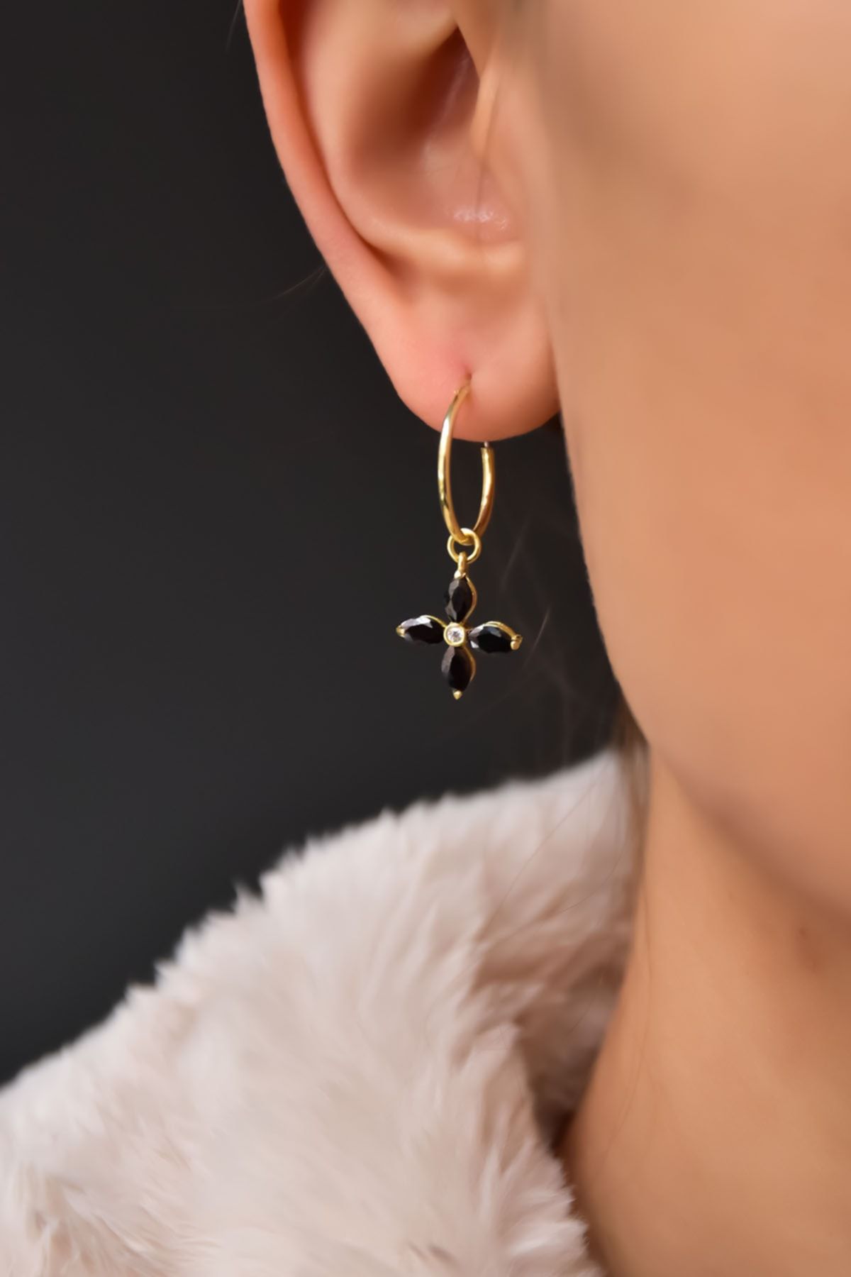 Etiketler925 Ayar Gümüş Gold Kaplama Siyah Zirkon Taşlı Plumeria Halka Küpe