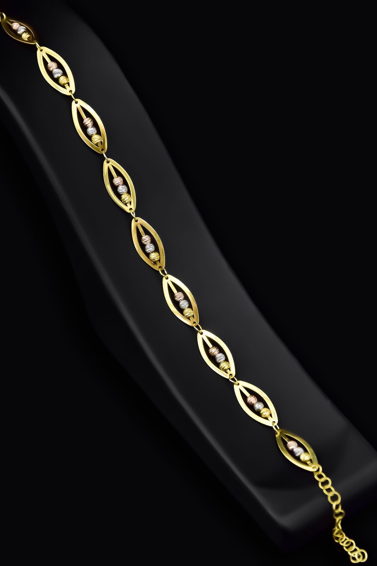 Maden : 925 Ayar Gümüş . Kaplama Gold. En x Boy: 7 mm *1,4 cm. Bileklik Ağırlık: 2,60 gr. Zincir Boyu: 18 cm. Teslimat : Ürün kutusunda gönderilecektir. Gümüş ve değerli taşlar nedeniyle belirtilen ortalama ürün ağırlığında ± %5 sapma olabilmektedir. Kullanım: Parfüm, dezenfektan, çamaşır suyu gibi kimyasallardan uzak tutunuz.