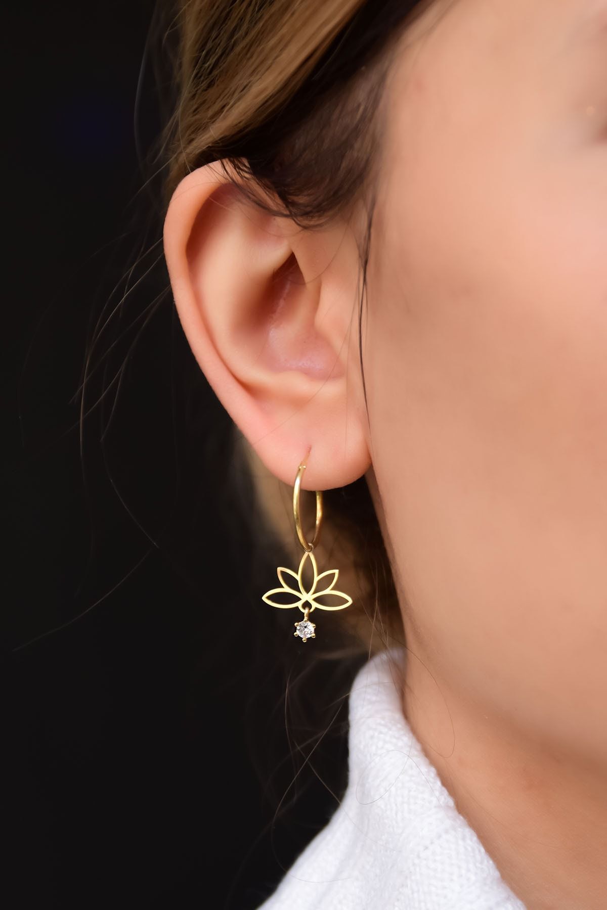925 Ayar Gümüş Gold Kaplama Tek Taş Lotus Halka Küpe