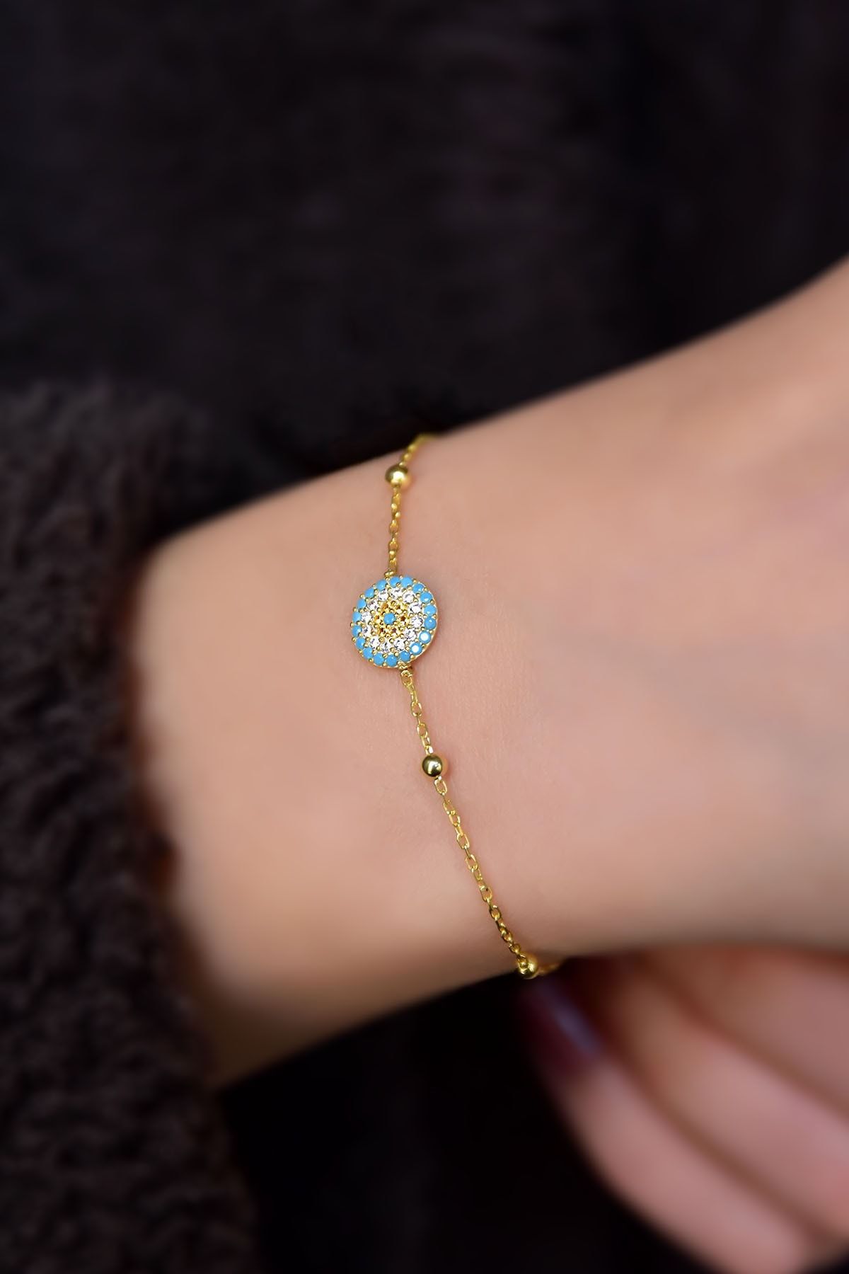 925 Ayar Gümüş Gold Kaplama Top Zincirli, Firuze Zirkon Taşlı Minimal Nazar Bileklik