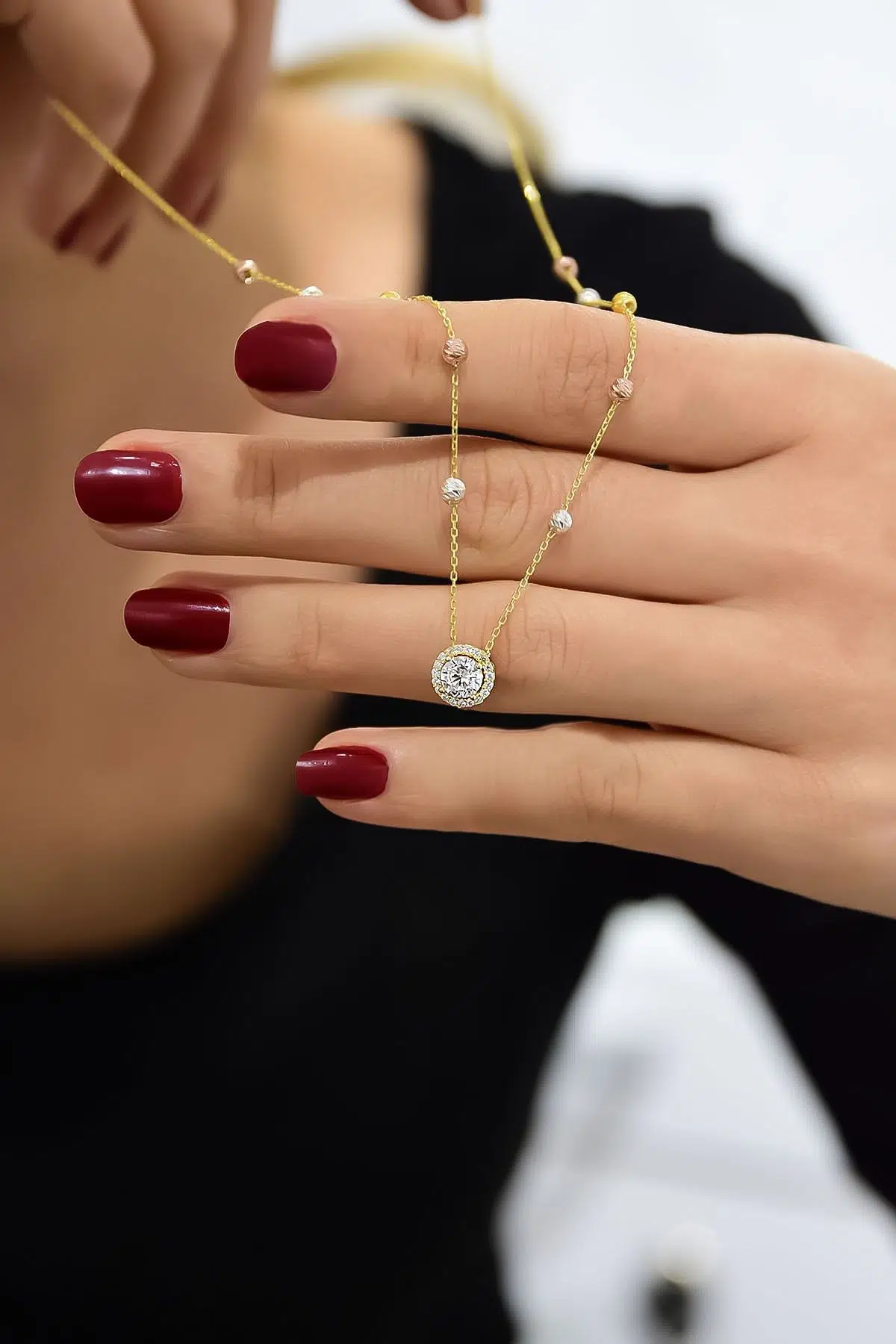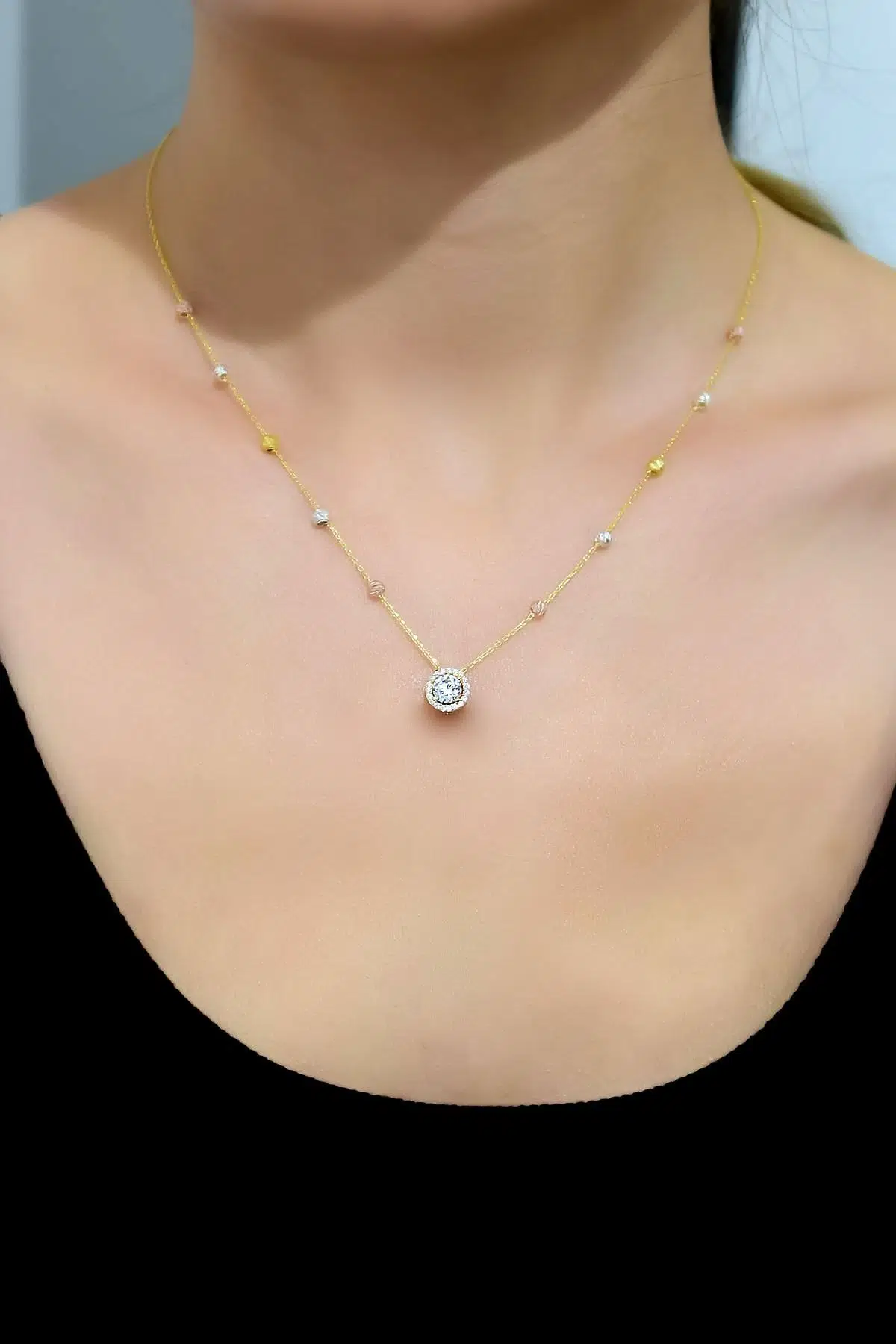 Etiketler925 Ayar Gümüş Gold Kaplama Üç Renk Dorika Toplu Zirkon Tektaş Kolye
