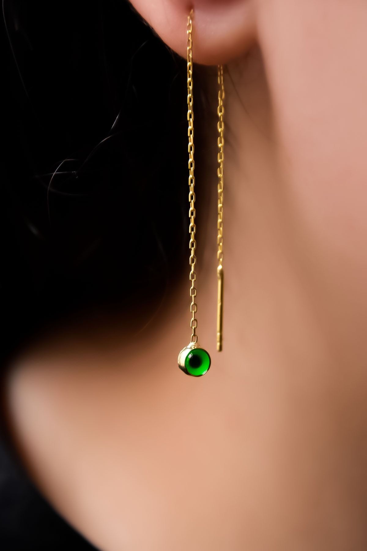 Etiketler925 Ayar Gümüş Gold Kaplama Yeşil Cam Göz Zincir Küpe