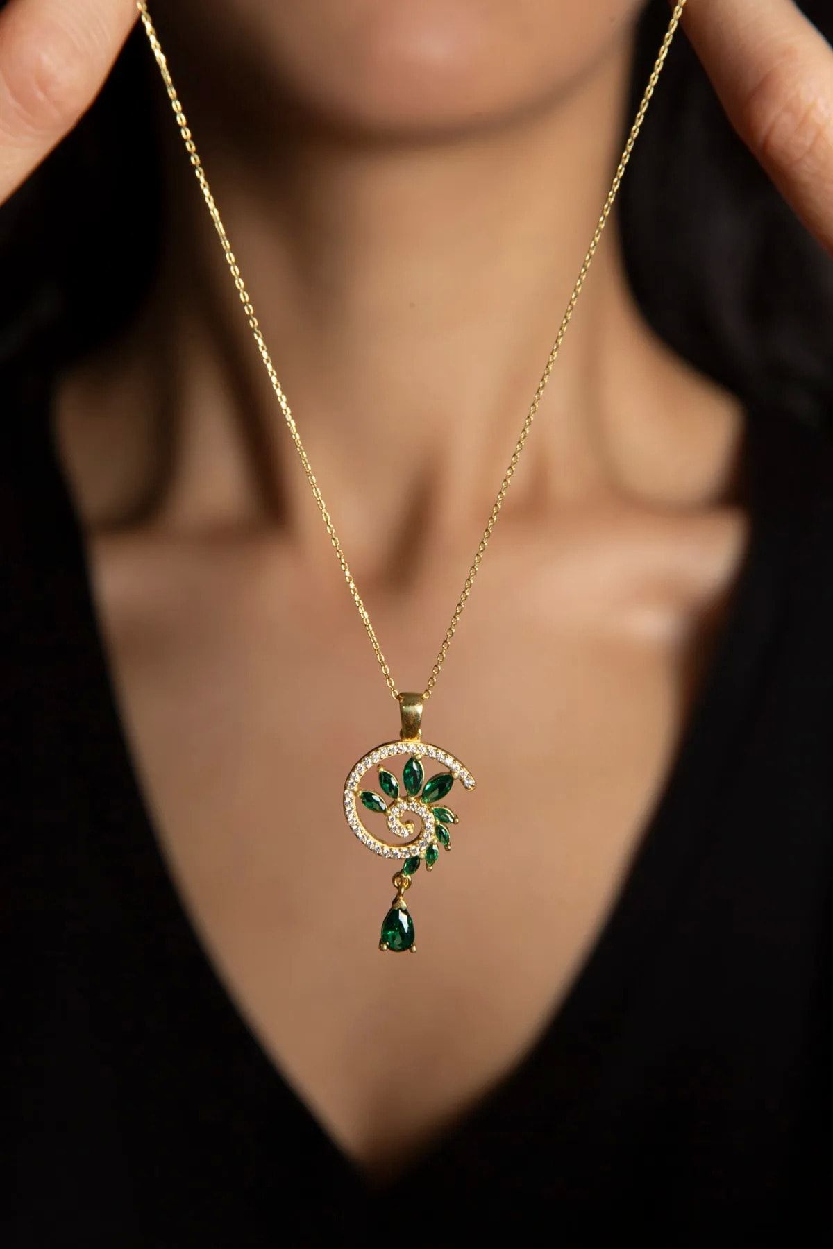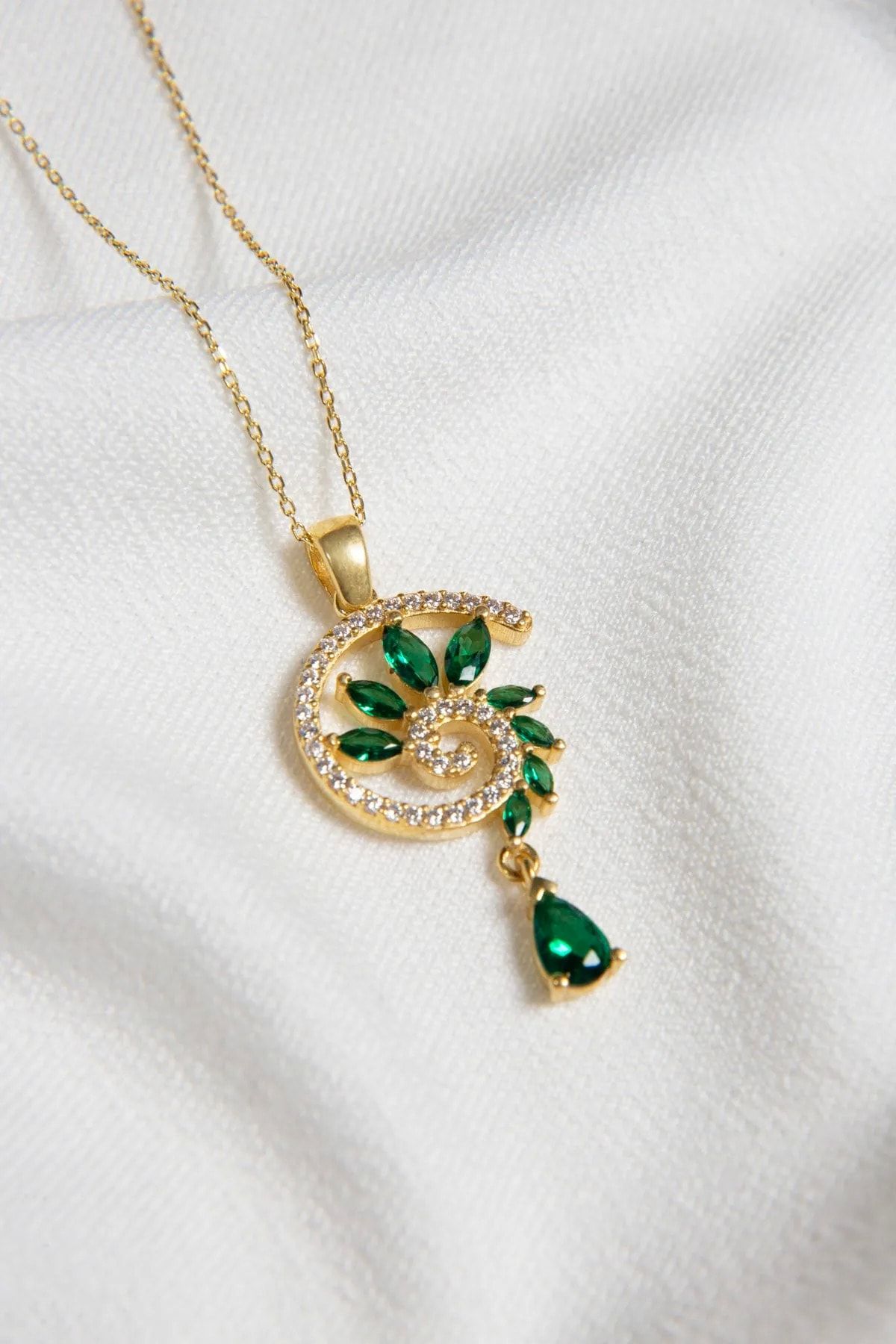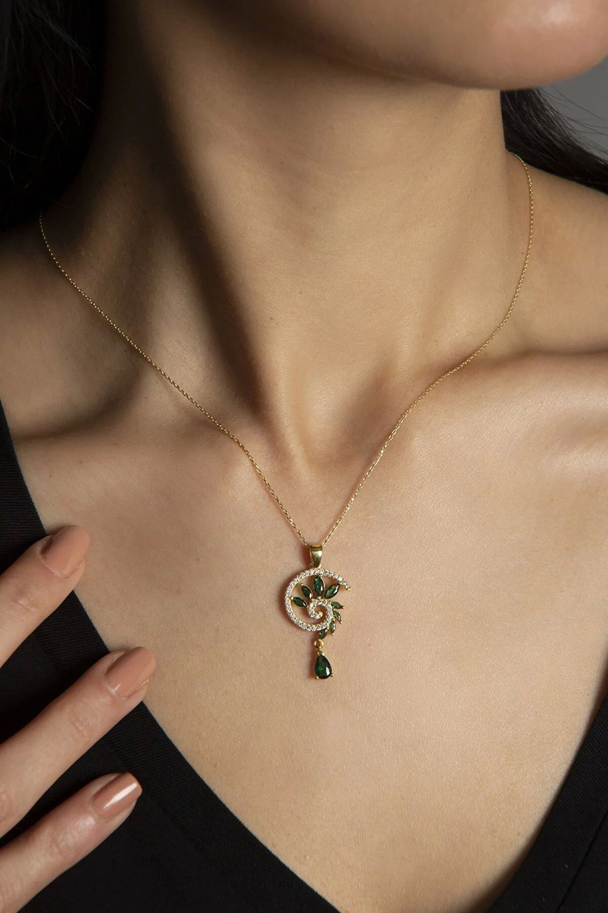 925 Ayar Gümüş Gold Kaplama Yeşim Renkli Spiral Snail Tasarım Kolye