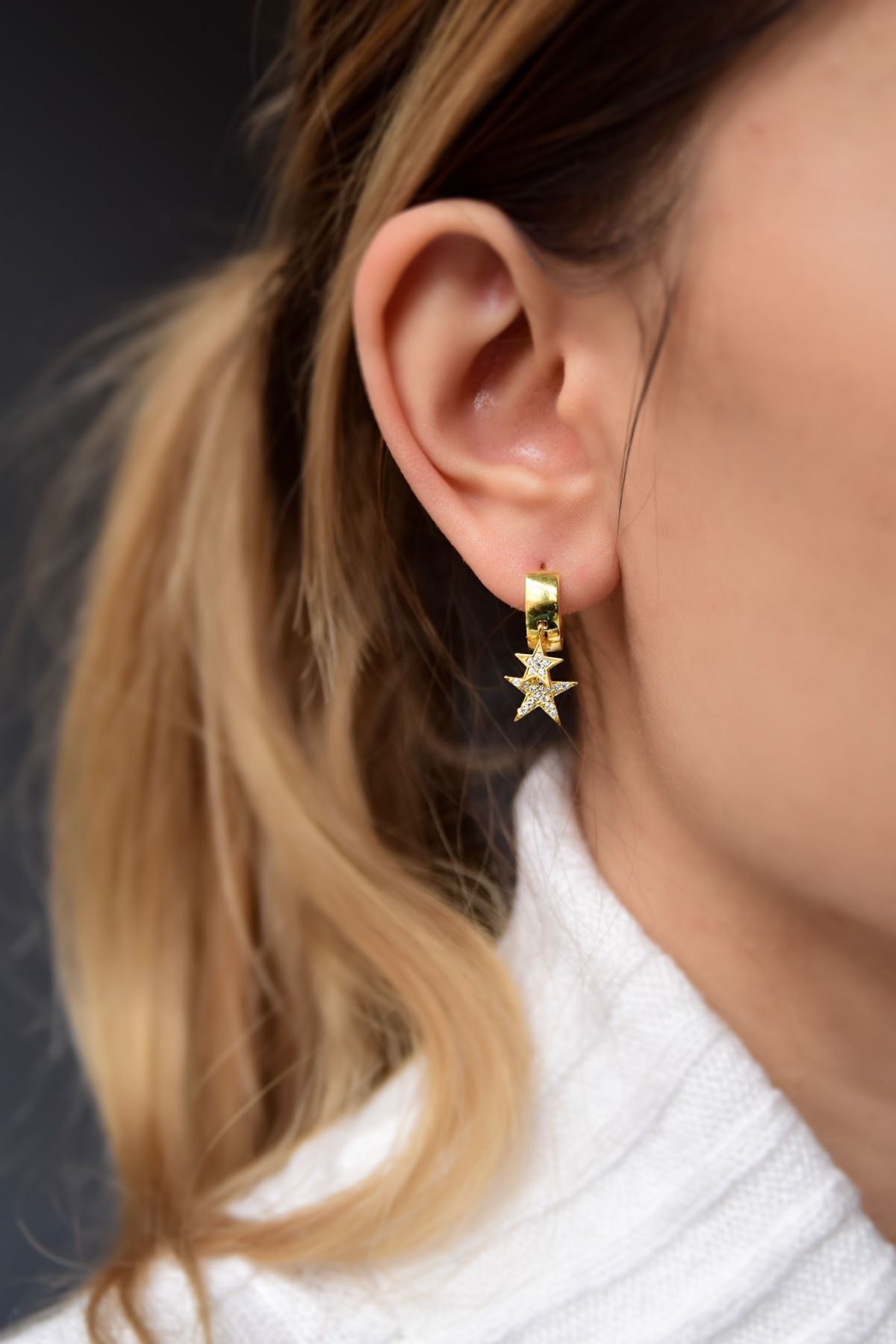 Maden : 925 ayar gümüş. Kaplama: Gold. Halk Çap: 1,2 cm. En:5 mm. Yıldız Fügür:1 cm. Ürün ağırlığı :3,37 gr ( +-). Taş: Zirkon. Gümüş ve değerli taşlar nedeniyle belirtilen ortalama ürün ağırlığında ± %10 sapma olabilmektedir. Teslimat: Ürün ahşap hediye kutusunda gönderilecektir. Kullanım: Parfüm, dezenfektan, çamaşır suyu gibi kimyasallardan uzak tutunuz.