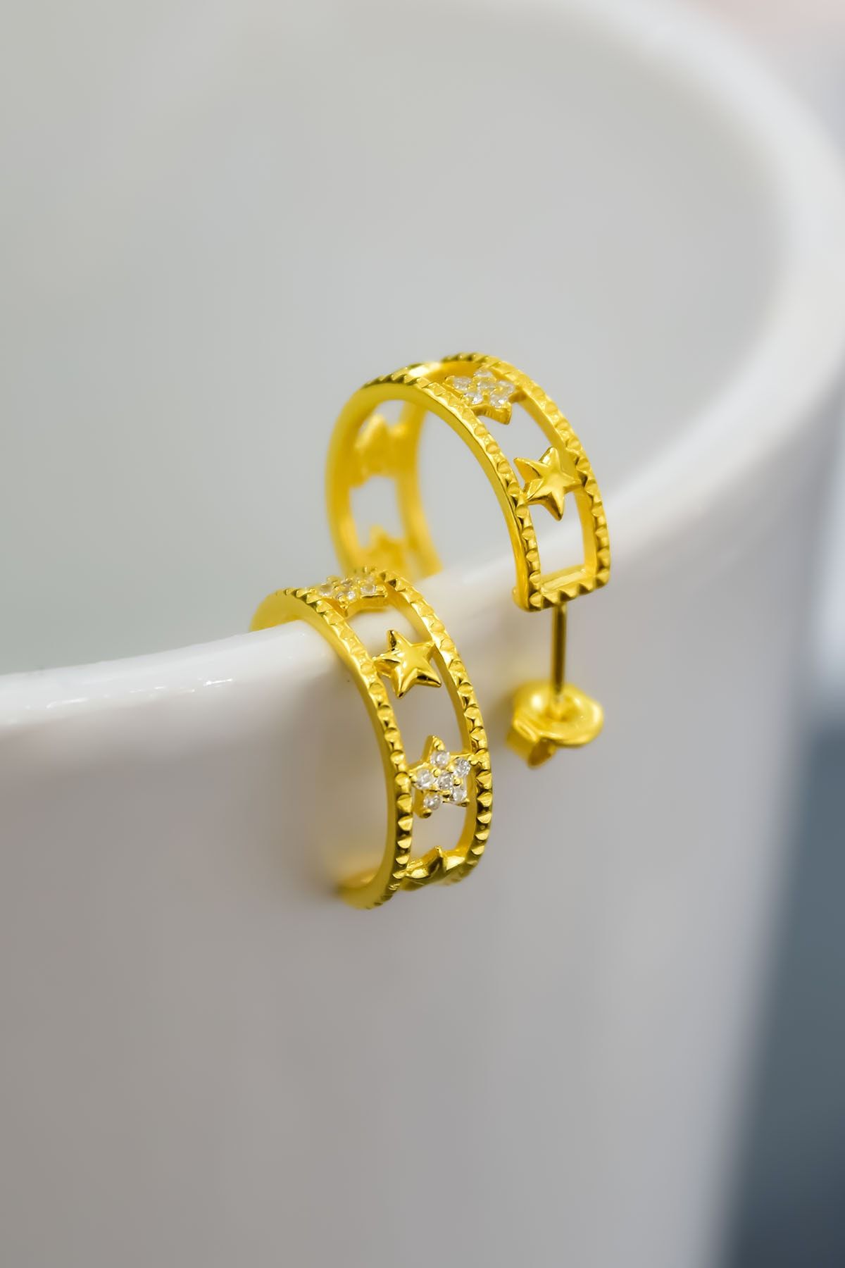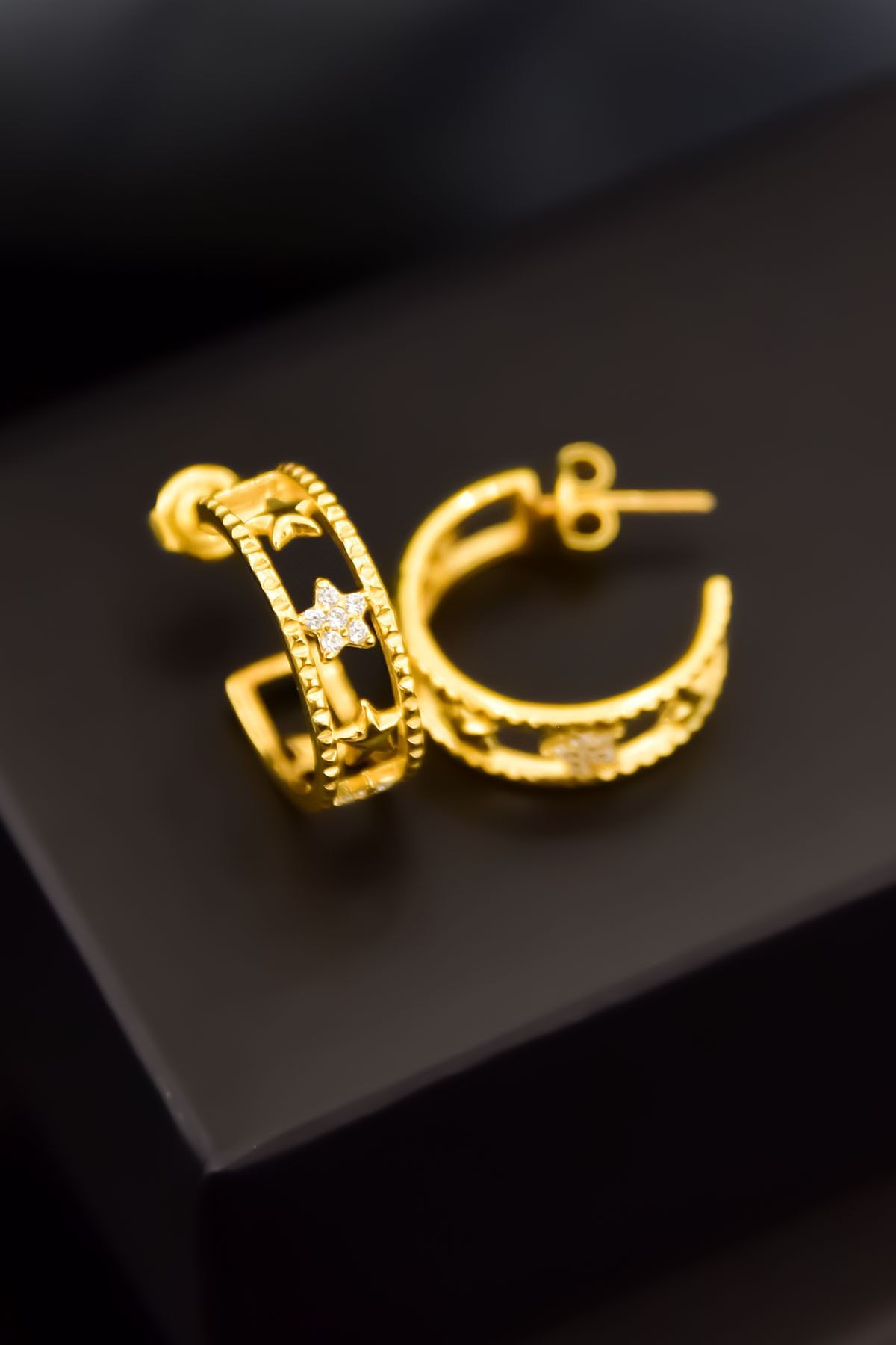 925 Ayar Gümüş. Kaplama: Gold. Ürün Ağırlığı :3,21 Gr. ( +-). Halka Çapı: 1,6 cm. Gümüş ve değerli taşlar nedeniyle belirtilen ortalama ürün ağırlığında ± %5 sapma olabilmektedir. Teslimat: Ürün ahşap hediye kutusunda gönderilecektir. Kullanım: Parfüm, dezenfektan, çamaşır suyu gibi kimyasallardan uzak tutunuz.