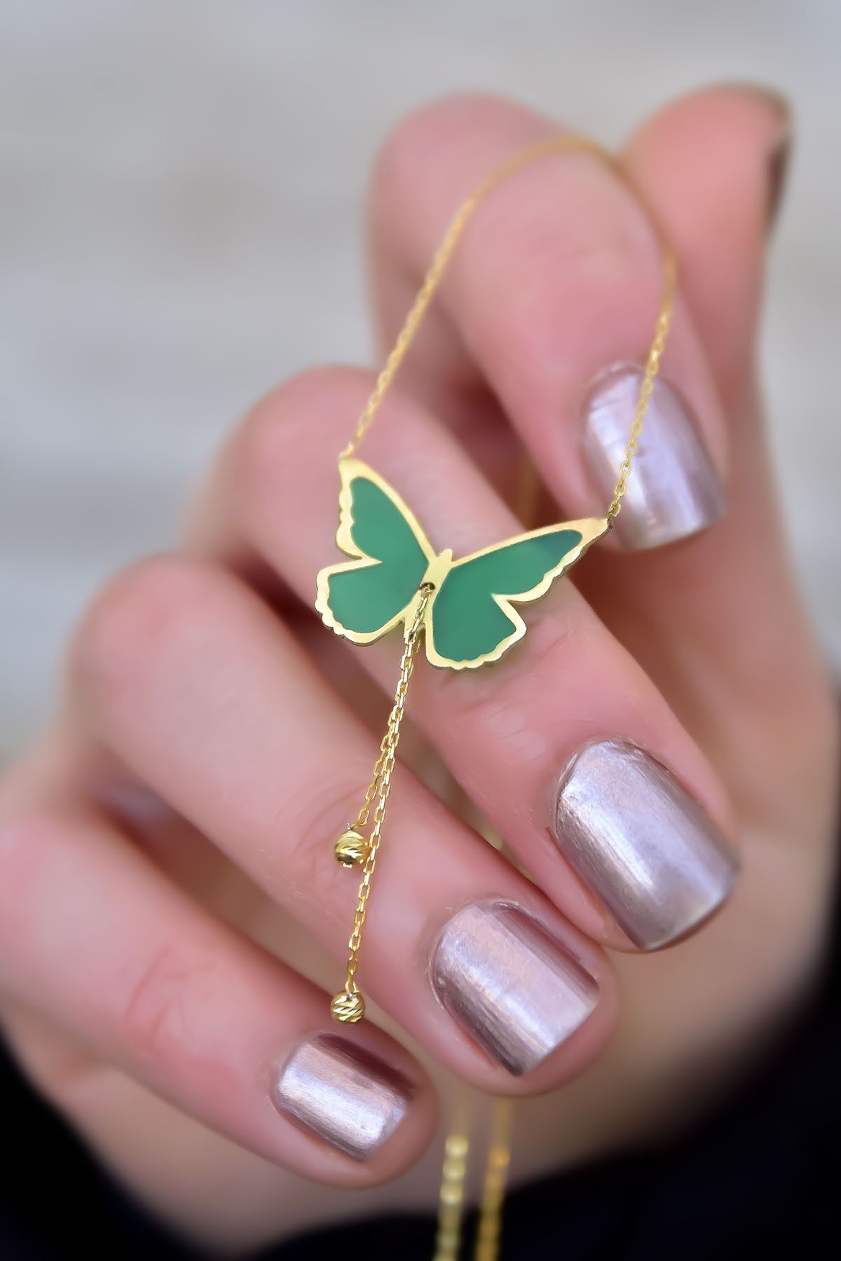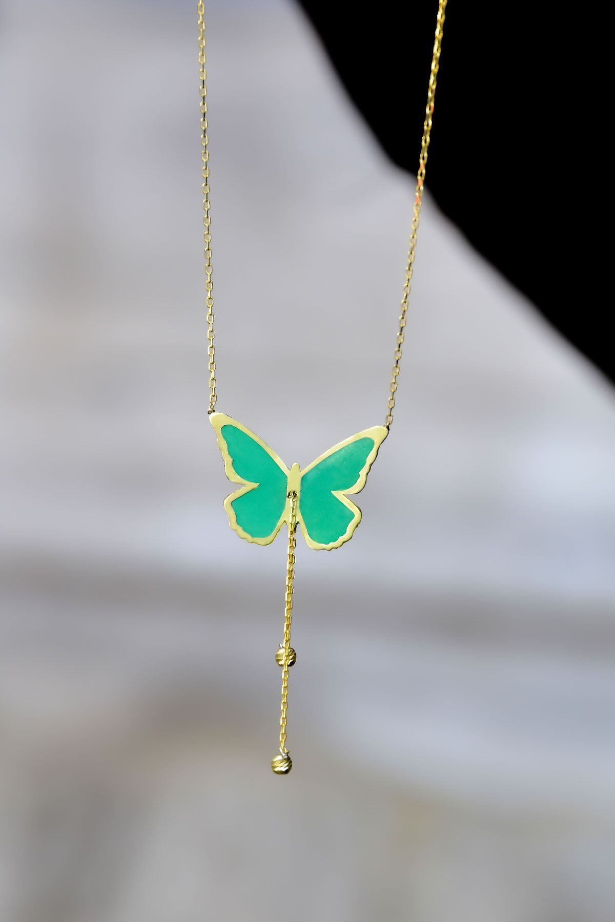 Etiketler925 Ayar Gümüş Gold Parlayan Rüya Serisi Tasarım Ebruli Cam Boyalı Dorika Toplu Kelebek Kolye