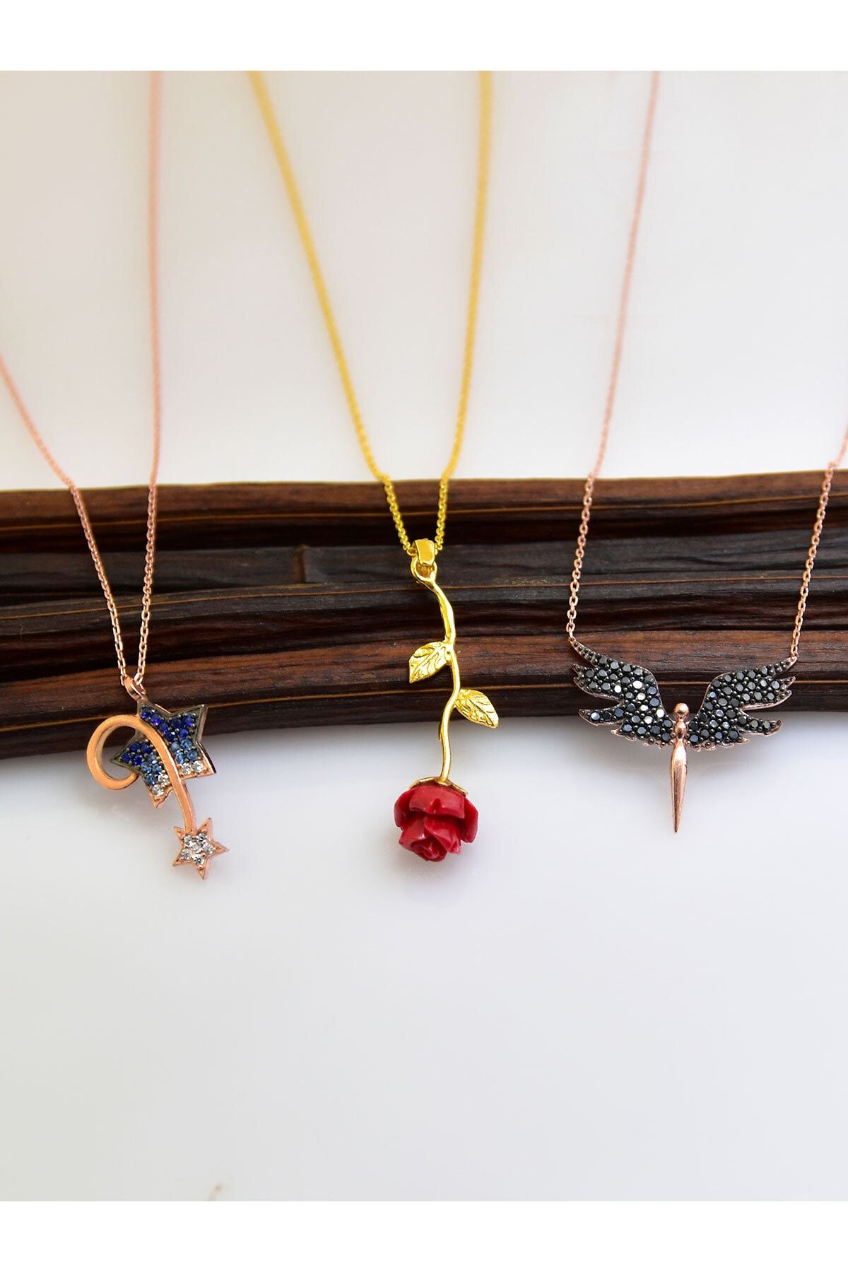 Maden: 925 Ayar Gümüş.Kaplama: Gold(GÜL), Rose(KAYAN YILDIZ,MİKAİL).Taş: GÜL(Mercan), KAYAN YILDIZ, MİKAİL( zirkon ).Mikail En-Boy, Ağırlık:3 x 2 Cm, 1,55 gr.Kayan Yıldız En-Boy, Ağırlık 2 x,1,5 cm ,1,58gr:Gül En-Boy,Ağırlık: 7mm x 3 cm, 1,84 gr.Zincir Uzunluk: 42cm.Teslimat: Ürün ahşap hediye kutusunda gönderilecektir.''Gümüş ürünlerin yapısı gereği kararmalar meydana gelebilir daha uzun ömürlü olması için;Parfüm gibi kozmetik ürünlere direkt temas etmediği sürece ürün ömrü daha uzun olacaktır.''