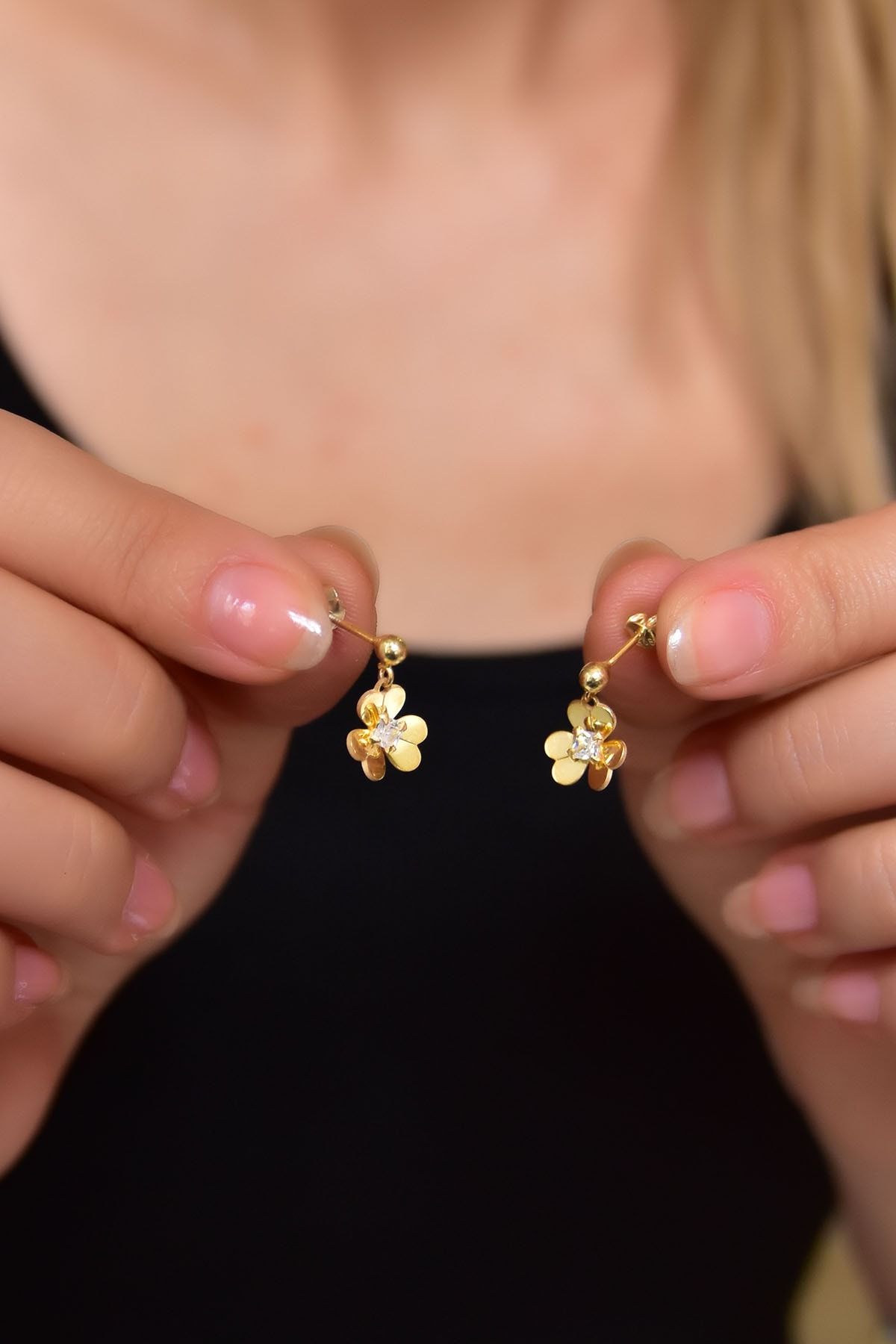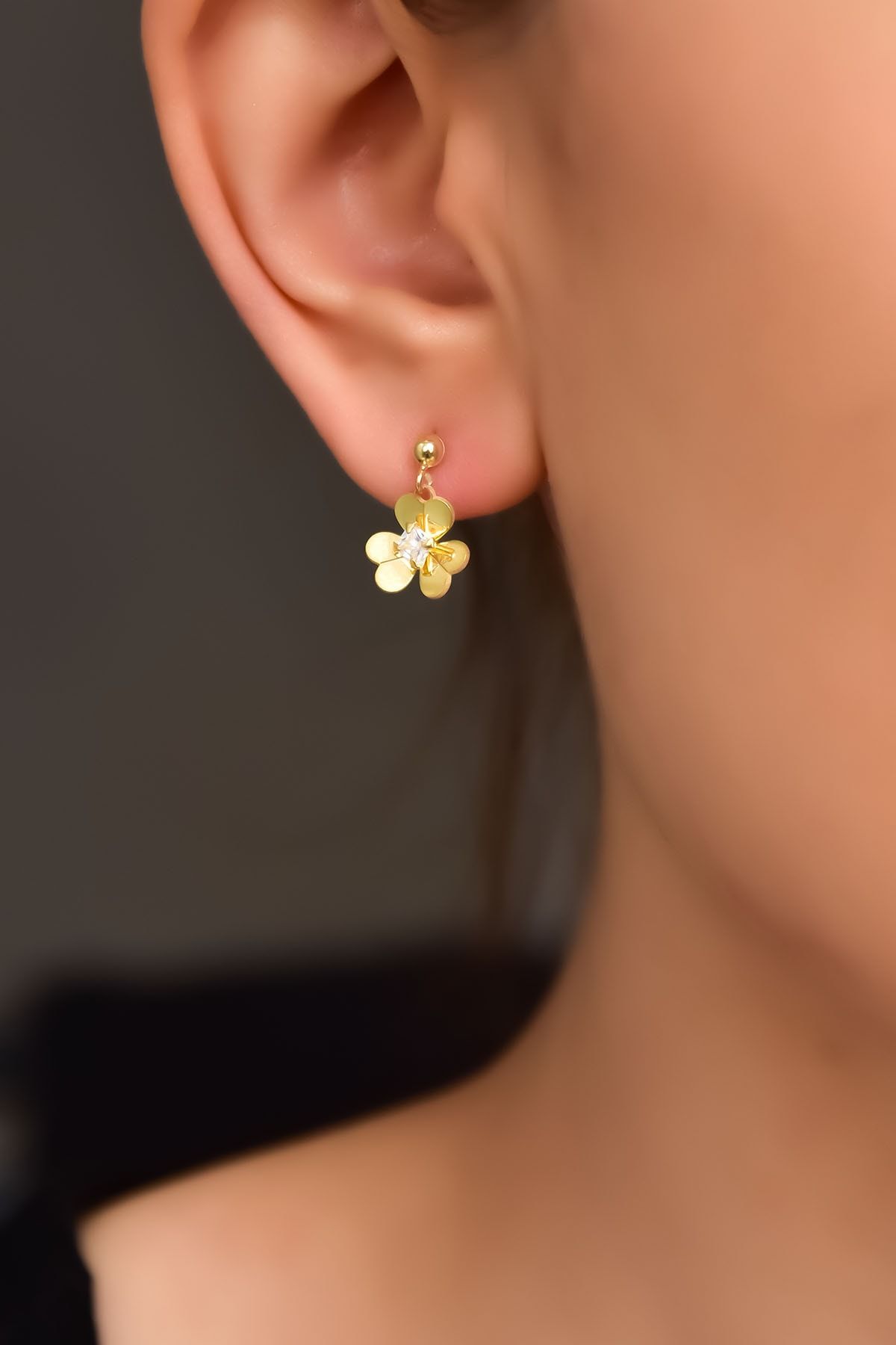 Etiketler925 Ayar Gümüş Hediyeli Gold Kaplama Sallantılı Frezya Çiçeği Küpe