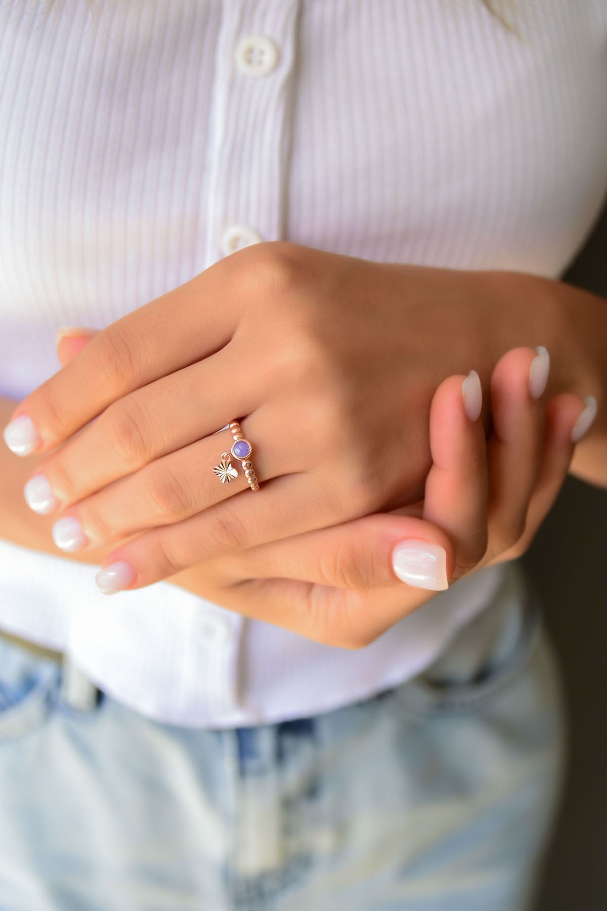 Etiketler925 Ayar Gümüş Lila Ay Taşlı Çiçek Motifli Ayarlanabilir Kadın Yüzük