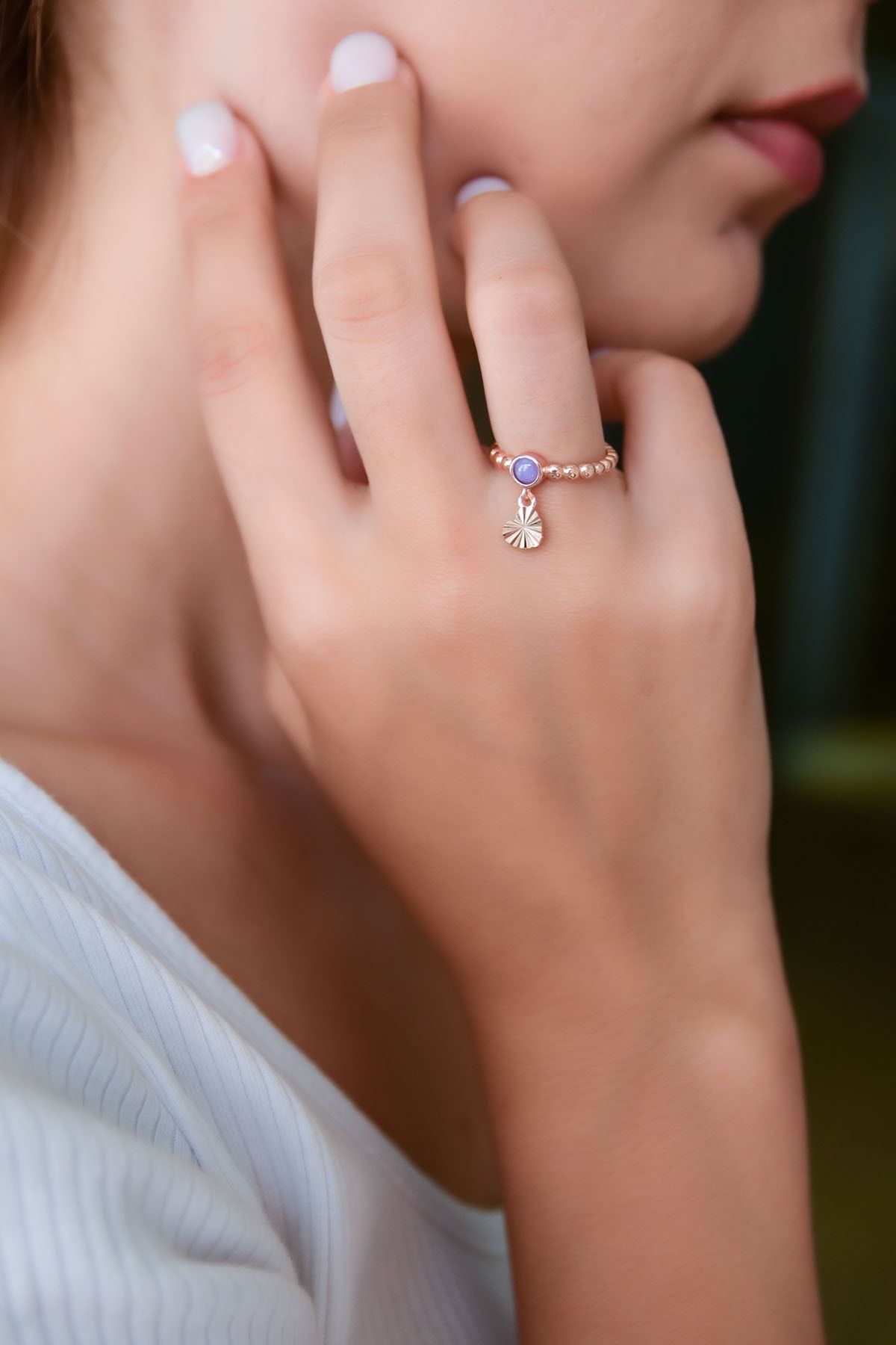 Etiketler925 Ayar Gümüş Lila Ay Taşlı Kalp Motifli Ayarlanabilir Kadın Yüzük