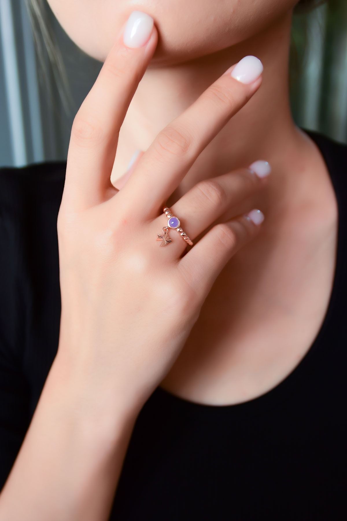925 Ayar Gümüş Lila Ay Taşlı Kırlangıç Motifli Ayarlanabilir Kadın Yüzük