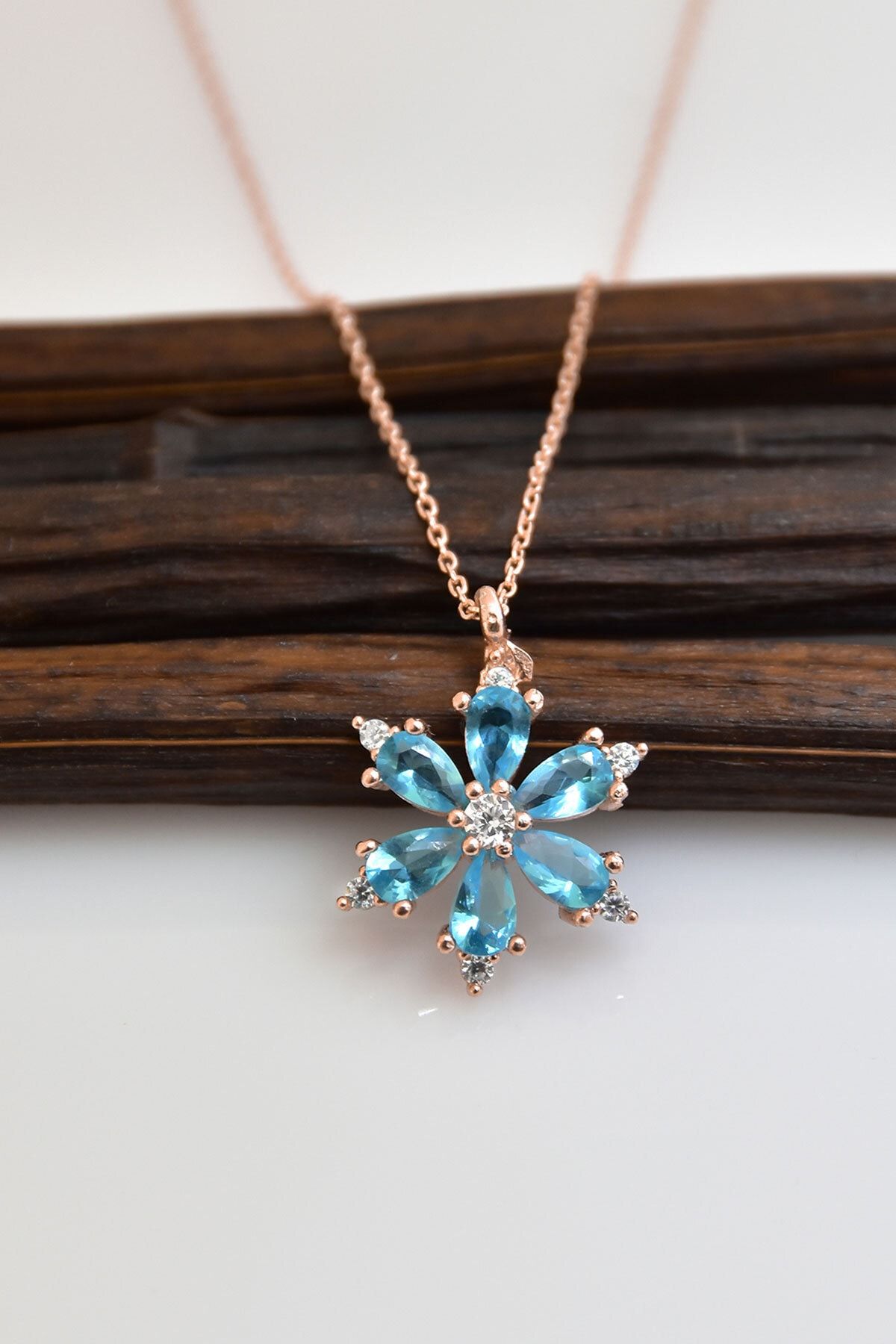 Maden : 925 Ayar Gümüş.Kaplama: Rose Altın. .Renk : Mavi Beyaz.Taş: Zirkon.Ürün Ebat En x Boy: 1,5 x 1,5 cm.Zincir Uzunluğu: 42 cm.Ürün Ağırlığı : 2,35 Gr ( +-). Gümüş ve değerli taşlar nedeniyle belirtilen ortalama ürün ağırlığında ± %5 sapma olabilmektedir.Teslimat: Ürün ahşap hediye kutusunda gönderilecektir.Kullanım: Parfüm,dezenfektan,çamaşır suyu gibi kimyasallardan uzak tutunuz.
