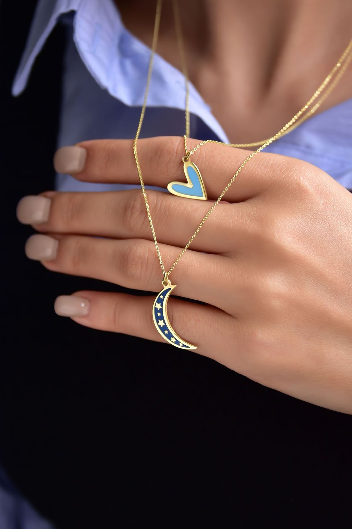 Maden : 925 Ayar Gümüş. Kaplama: Altın. Taş: Mine. Kalp En x Boy : 1,2 x 1,2 cm. Ay En x Boy : 0,7 x 2,0 cm. Kolye Uzunluğu: 45 cm. Ürün Ağırlığı : 3,07 Gr ( +-). Gümüşve değerli taşlar nedeniyle belirtilen ortalama ürün ağırlığında ± %10 sapmaolabilmektedir. Teslimat : Ürün kutusundagönderilecektir. Kullanım: Parfüm,dezenfektan,çamaşırsuyu gibi kimyasallardan uzak tutunuz.