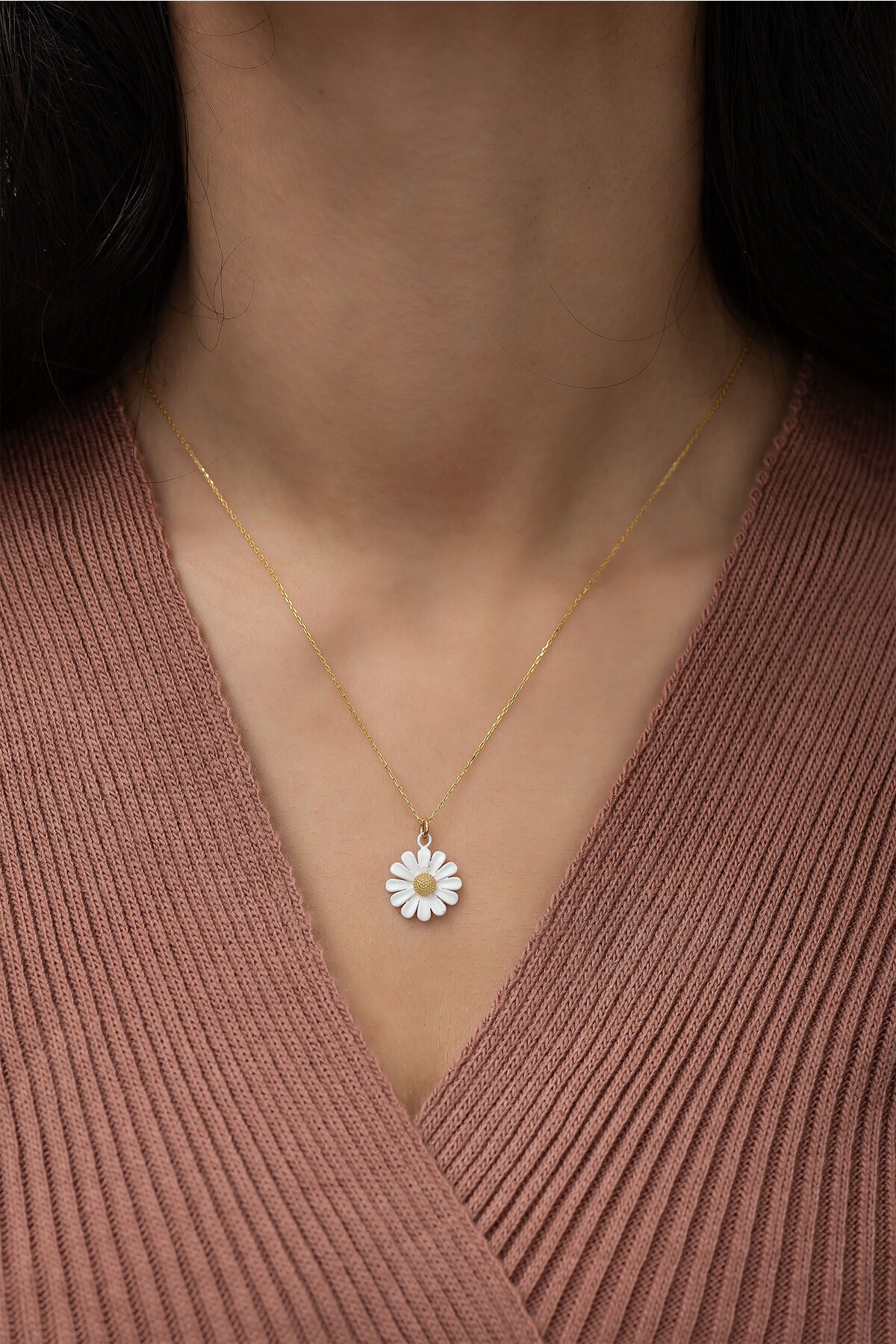 925 Ayar Gümüş Özel Tasarım Papatya Kolye Mineli Altın Kaplama