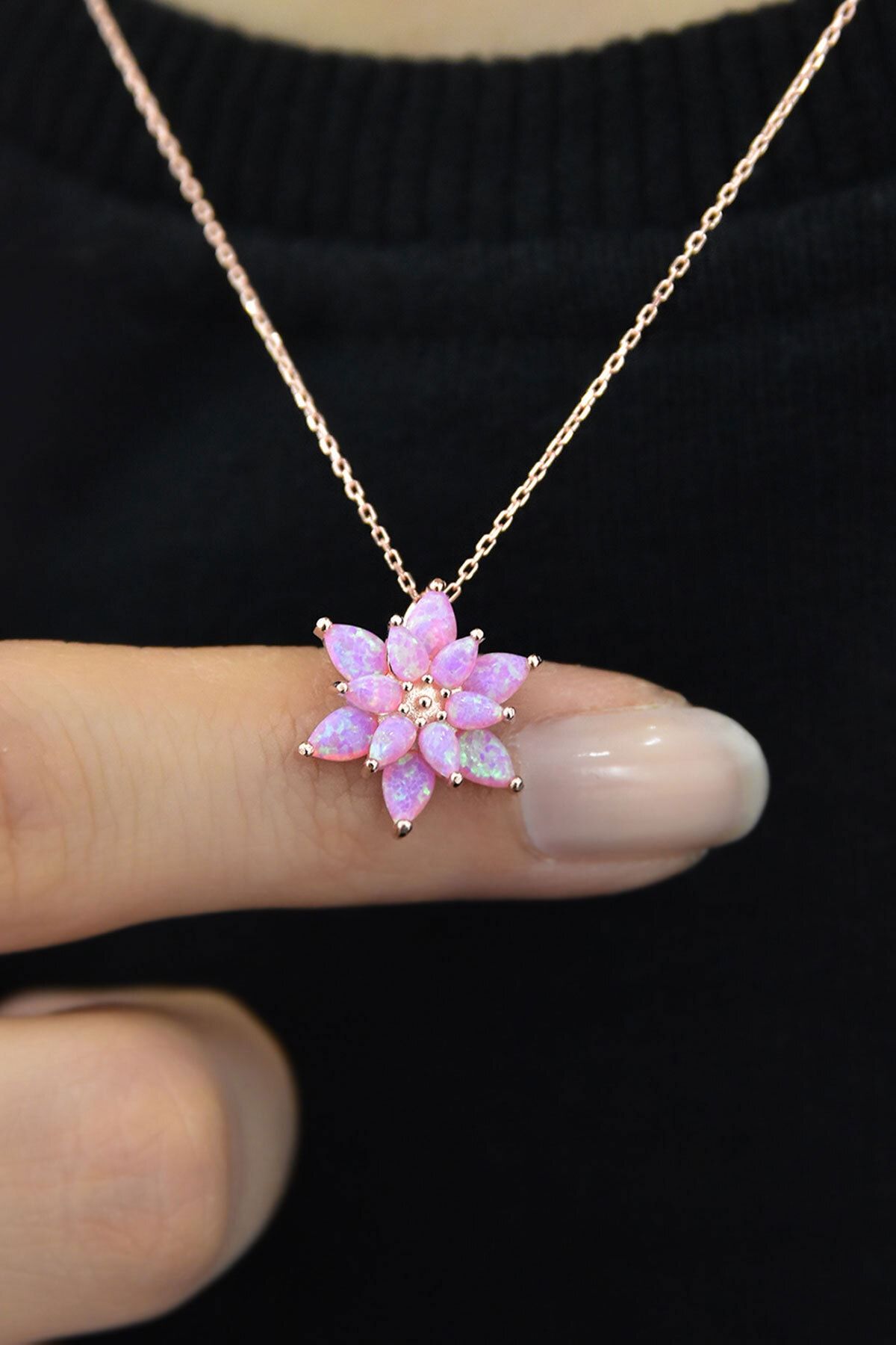 Etiketler925 Ayar Gümüş Pembe Doğal Opal Taşlı Lotus Kolye