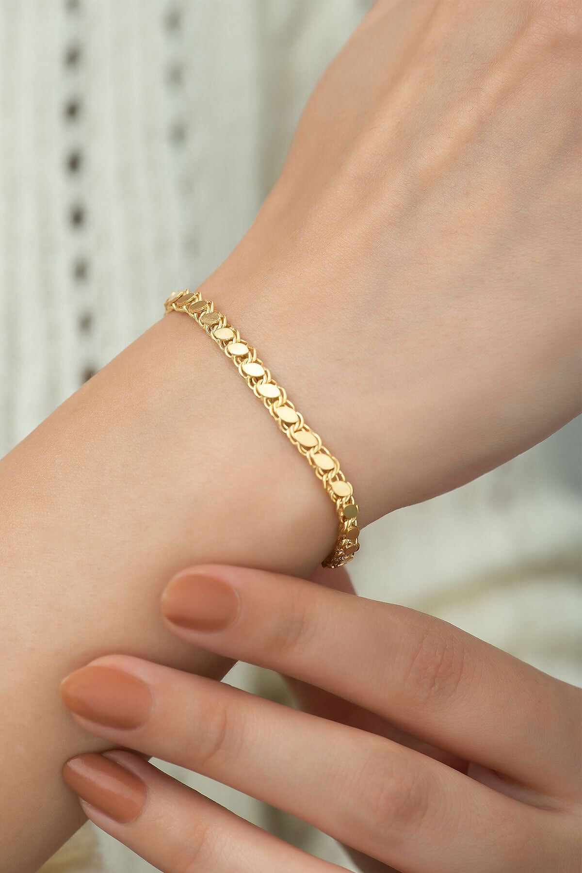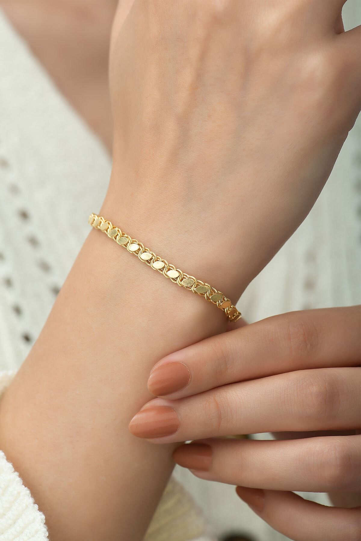 925 Ayar Gümüş Pul Zincir Kadın Bileklik Altın KaplamaMaden : 925 Ayar Gümüş.Kaplama: Altın.Renk : Altın.Taş:Zincir uzunluğu : 18 cm.Ürün Ağırlığı : 5,00 Gr ( +-).Teslimat: Ürün ahşap hediye kutusunda gönderilecektir.