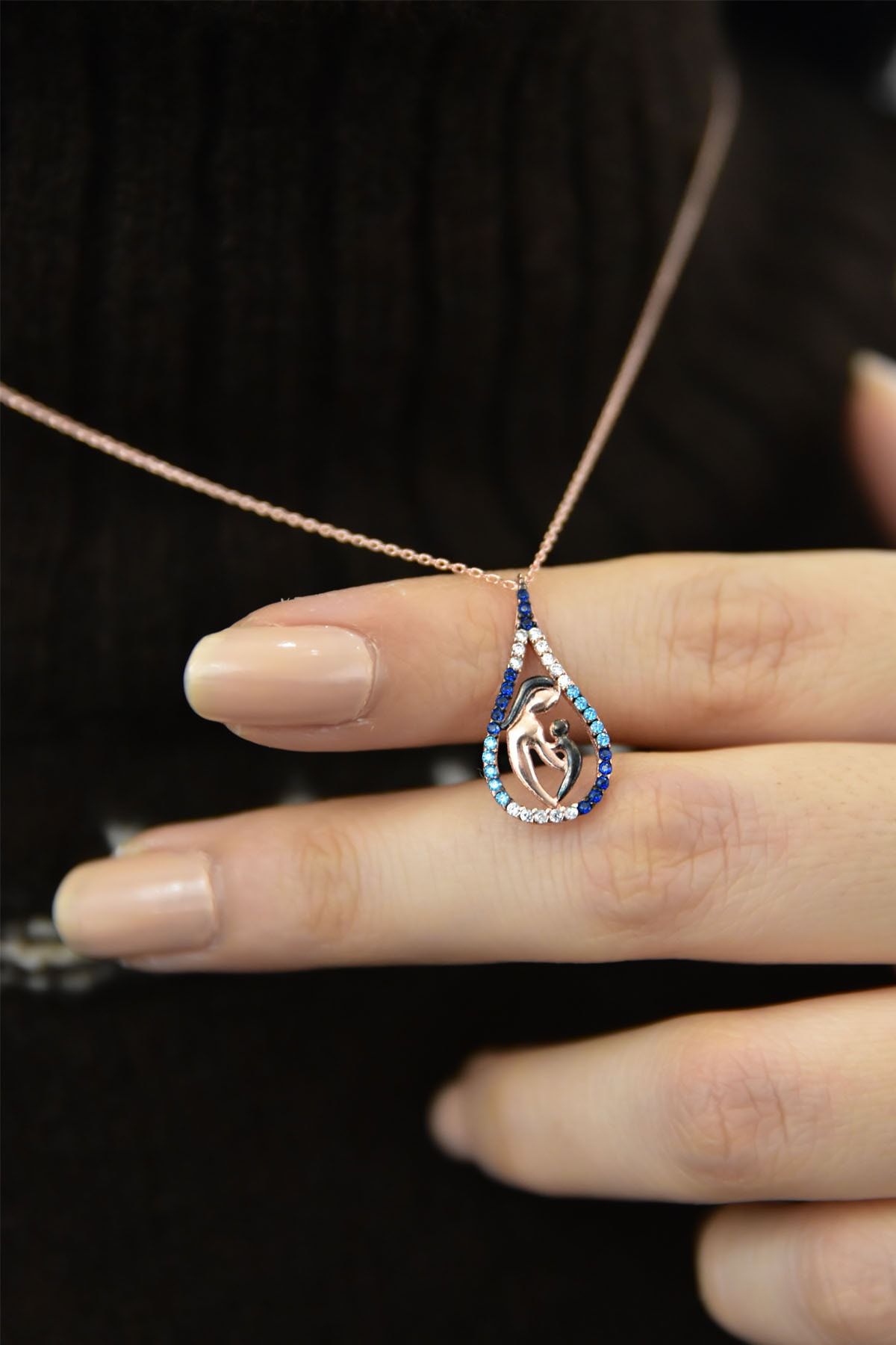 925 Ayar Gümüş Renkli Taşlı Anne Çocuk Damla Kadın Kolye