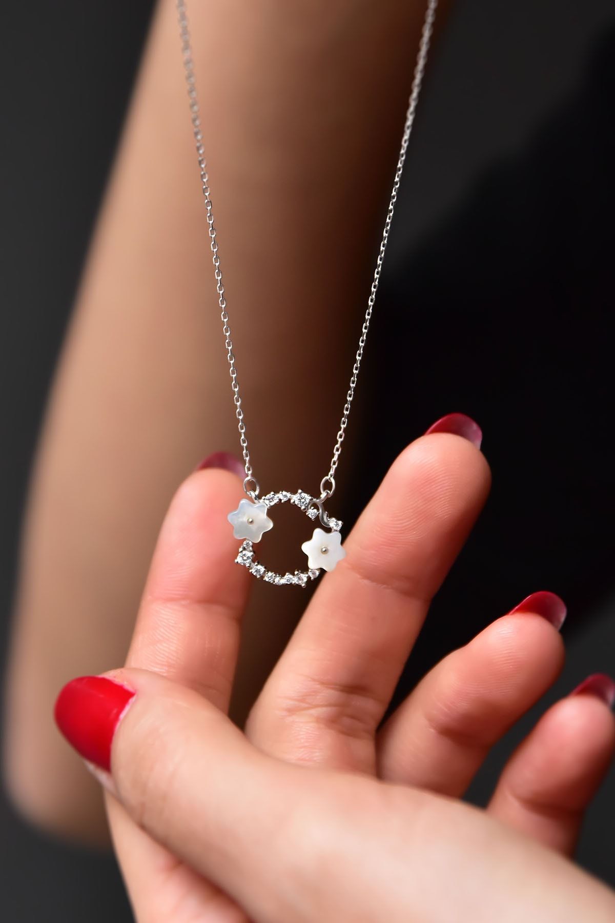 Maden : 925 Ayar Gümüş. Kaplama: Rodyum. En x Boy: 2,0 x 2,0 cm. Zincir Uzunluğu: 42 cm. Taş: Sedef, Zirkon. Ürün Ağırlığı : 1,75 Gr ( +-). Gümüş ve değerli taşlar nedeniyle belirtilen ortalama ürün ağırlığında ± %5 sapma olabilmektedir. Kullanım: Parfüm, dezenfektan, çamaşır suyu gibi kimyasallardan uzak tutunuz.
