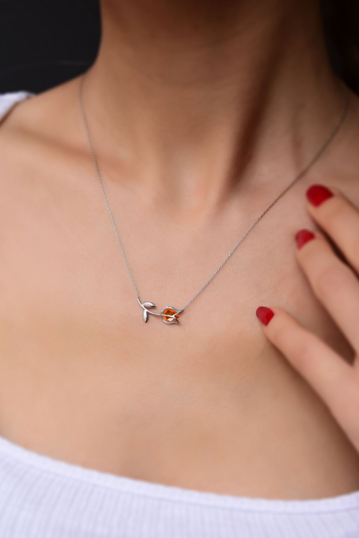 Etiketler925 Ayar Gümüş Rodyum Kaplama Turuncu Taşlı Lale Kolye